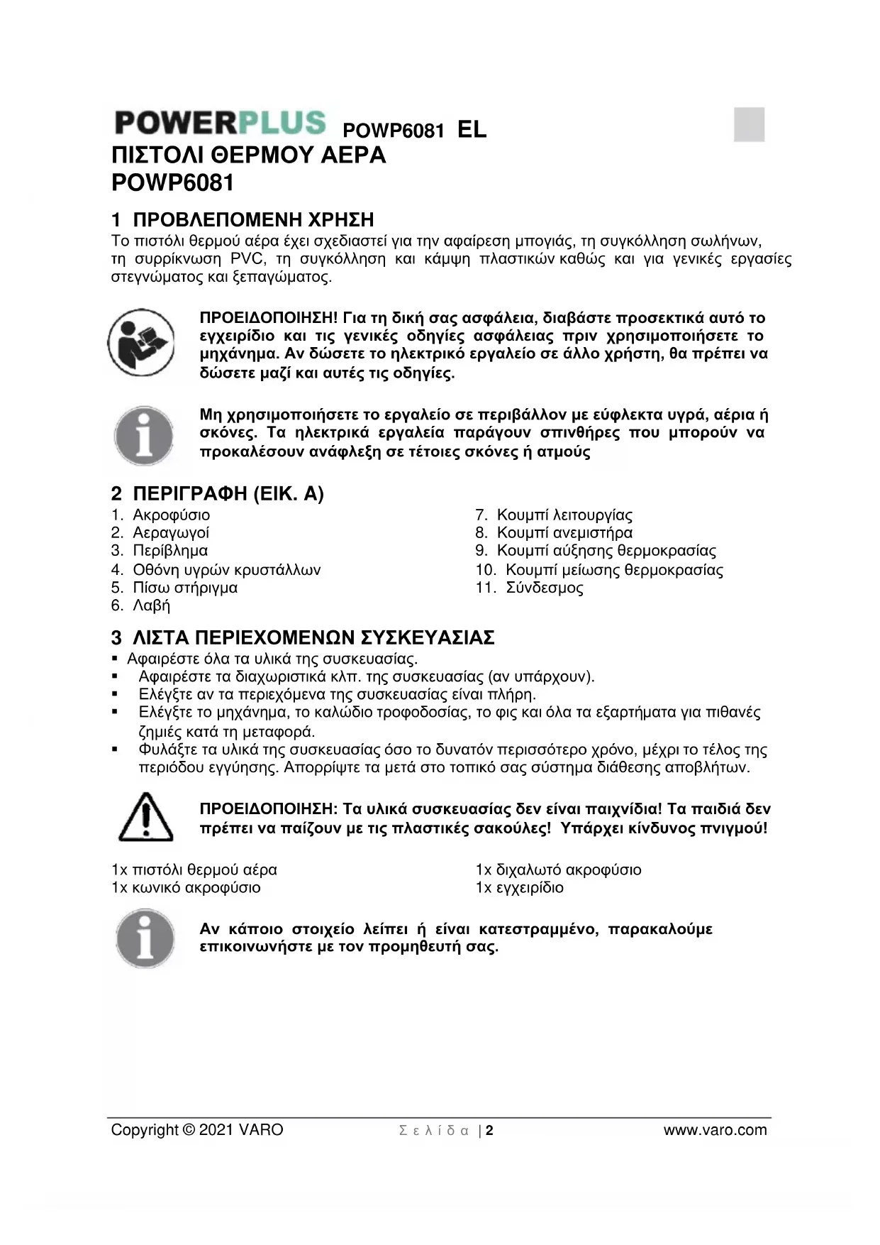 - 13 ΠΕΡΙΒΑΛΛΟΝ POWP6081 EL Copyright © 2021 VARO Σ ε λ ί δ α | 2 www.varo.com ΠΙΣΤΟΛΙ ΘΕΡΜΟΥ ΑΕΡΑ POWP6081 1 ΠΡΟΒΛΕΠΟΜΕΝΗ ΧΡΗΣΗ Το πιστόλι θερμού αέρα έχει σχεδιαστεί για την αφαίρεση μπογιάς, τη συγκόλληση σωλήνων, τη συρρίκνωση PVC, τη συγκόλληση και κάμψη πλαστικών καθώς και για γενικές εργασίες στεγνώματος και ξεπαγώματος. ΠΡΟΕΙΔΟΠΟΙΗΣΗ! Για τη δική σας ασφάλεια, διαβάστε προσεκτικά αυτό το εγχειρίδιο και τις γενικές οδηγίες ασφάλειας πριν χρησιμοποιήσετε το μηχάνημα. Αν δώσετε το ηλεκτρικό εργαλείο σε άλλο χρήστη, θα πρέπει να δώσετε μαζί και αυτές τις οδηγίες. Μη χρησιμοποιήσετε το εργαλείο σε περιβάλλον με εύφλεκτα υγρά, αέρια ή σκόνες. Τα ηλεκτρικά εργαλεία παράγουν σπινθήρες που μπορούν να προκαλέσουν ανάφλεξη σε τέτοιες σκόνες ή ατμούς 2 ΠΕΡΙΓΡΑΦΗ (ΕΙΚ. A) p. 12