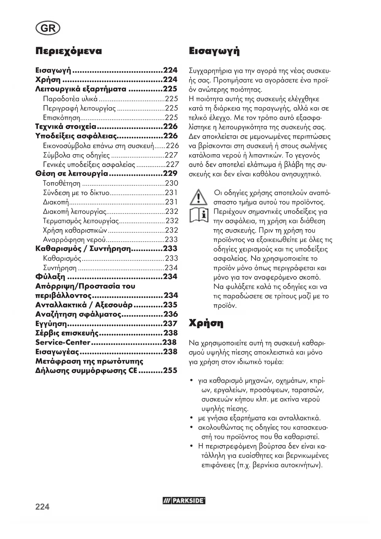 - Η περιστρεφόμενη βούρτσα δεν είναι κα- τάλληλη για ευαίσθητες και βερνικωμένες επιφάνειες (π.χ. βερνίκια αυτοκινήτων). Περιεχόμενα Εισαγωγή .....................................224 Χρήση .........................................224 Λειτουργικά εξαρτήματα ..............225 Παραδοτέα υλικά ....................................225 Περιγραφή λειτουργίας ..........................225 Επισκόπηση..............................................225 Τεχνικά στοιχεία ...........................226 Υποδείξεις ασφάλειας...................226 Εικονοσύμβολα επάνω στη συσκευή ...... 226 Σύμβολα στις οδηγίες .............................227 Γενικές υποδείξεις ασφαλείας ................227 Θέση σε λειτουργία ......................229 Τοποθέτηση .............................................230 Σύνδεση με το δίκτυο ..............................231 Διακοπή .................................................... 231 Διακοπή λειτουργίας................................232 Τερματισμός λειτουργίας ......................... 232 Χρήση καθαριστικών ...............................232 Αναρρόφηση νερού ................................233 Καθαρισμός / Συντήρηση.............233 Καθαρισμός ............................................. 233 Συντήρηση ...............................................234 Φύλαξη .......................................234 Απόρριψη/Προστασία του περιβάλλοντος ............................. 234 Ανταλλακτικά / Αξεσουάρ ............235 Αναζήτηση σφάλματος ................. 236 Εγγύηση .......................................237 Σέρβις επισκευής .......................... 238 Service- Center .............................238 Εισαγωγέας ..................................238 Μετάφραση της πρωτότυπης Δήλωσης συμμόρφωσης CE ..........255225