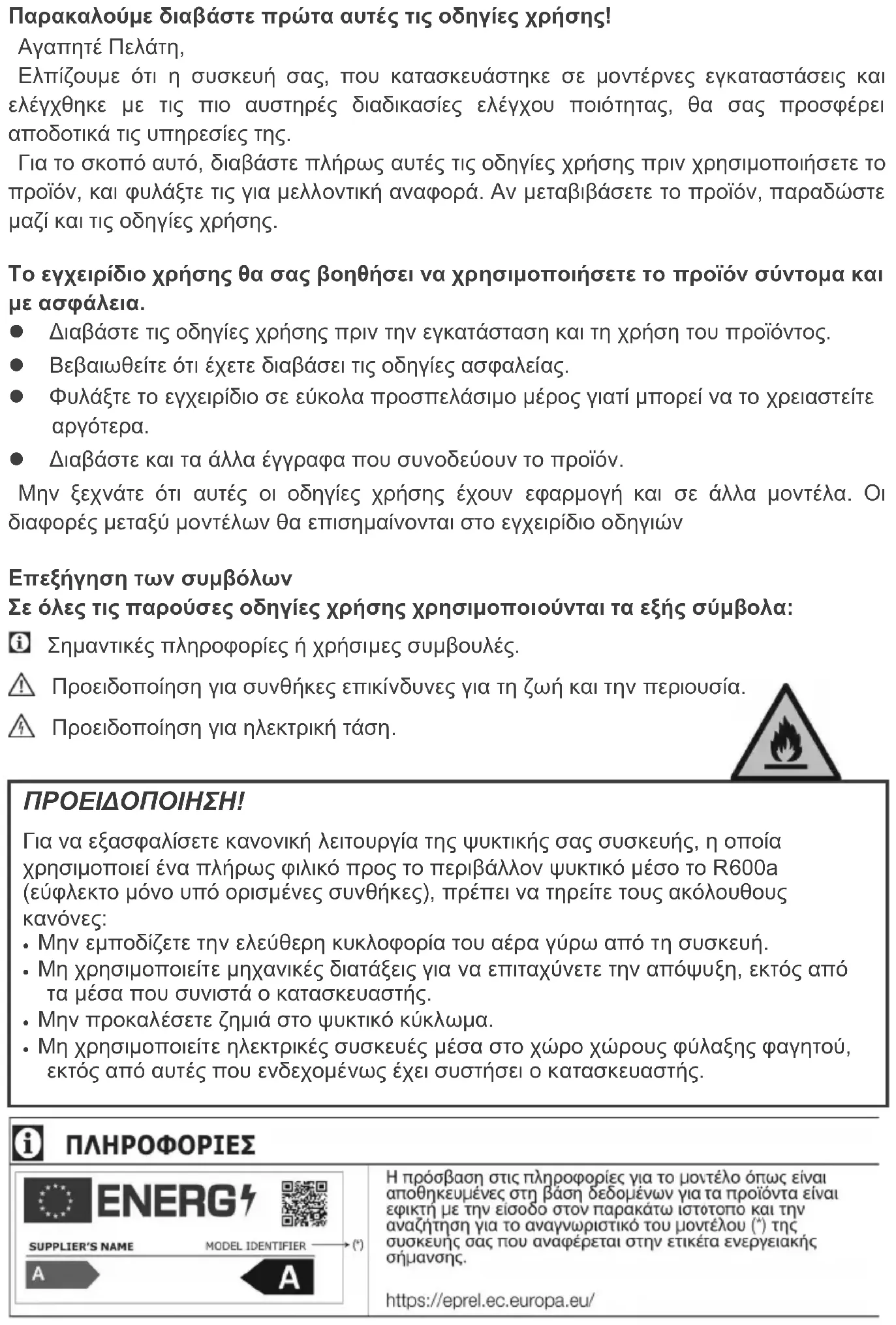 z Διαβάστε και τα άλλα έγγραφα που συνοδεύουν το προϊόν. Μην ξεχνάτε ότι αυτές οι οδηγίες χρήσης έχουν εφαρμογή και σε άλλα μοντέλα. Οι διαφορές μεταξύ μοντέλων θα επισημαίνονται στο εγχειρίδιο οδηγιών Επεξήγηση των συμβόλων Σε όλες τις παρούσες οδηγίες χρήσης χρησιμοποιούνται τα εξής σύμβολα: Σημαντικές πληροφορίες ή χρήσιμες συμβουλές. Προειδοποίηση για συνθήκες επικίνδυνες για τη ζωή και την περιουσία. Προειδοποίηση για ηλεκτρική τάση. ΠΡΟΕΙΔΟΠΟΙΗΣΗ! Για να εξασφαλίσετε κανονική λειτουργία της ψυκτικής σας συσκευής, η οποία χρησιμοποιεί ένα πλήρως φιλικό προς το περιβάλλον ψυκτικό μέσο το R600a (εύφλεκτο μόνο υπό ορισμένες συνθήκες), πρέπει να τηρείτε τους ακόλουθους