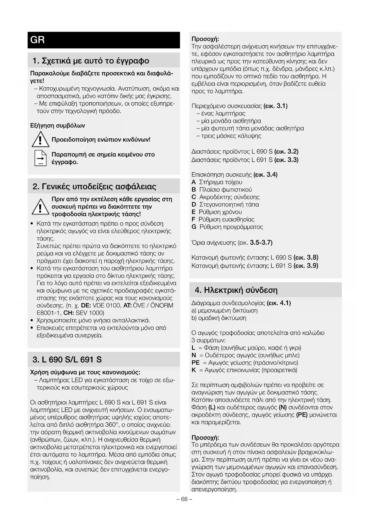 Χρήση σύμφωνα με τους κανονισμούς: – Λαμπτήρας LED για εγκατάσταση σε τοίχο σε εξω- τερικούς και εσωτερικούς χώρους Οι ασθητήριοι λαμπτήρες L690 S και L691 S είναι λαμπτήρες LED με ανιχνευτή κινήσεων. Ο ενσωματω- μένος υπέρυθρος αισθητήρας υψηλής ισχύος αποτε- λείται από διπλό αισθητήρα 360°, ο οποίος ανιχνεύει την αόρατη θερμική ακτινοβολία κινούμενων σωμάτων (ανθρώπων, ζώων, κλπ.). Η ανιχνευθείσα θερμική ακτινοβολία μετατρέπεται ηλεκτρονικά και ενεργοποιεί έτσι αυτόματα το λαμπτήρα. Μέσα από εμπόδια όπως π.χ. τοίχους ή υαλοπίνακες δεν ανιχνεύεται θερμική ακτινοβολία, και συνεπώς δεν επιτυγχάνεται ενεργο-