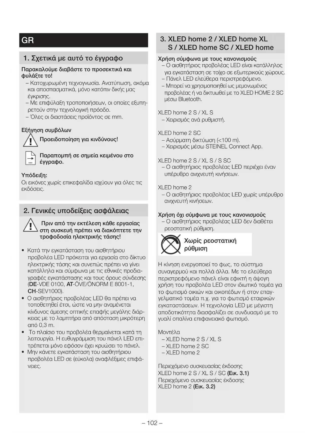 S/XLEDhome SC/XLEDhome Χρήση σύμφωνα με τους κανονισμούς – Ο αισθητήριος προβολέας LED είναι κατάλληλος για εγκατάσταση σε τοίχο σε εξωτερικούς χώρους. – Πάνελ LED ελεύθερα περιστρεφόμενο. – Μπορεί να χρησιμοποιηθεί ως μεμονωμένος προβολέας ή να δικτυωθεί με το XLED HOME2SC μέσω Bluetooth. XLEDhome2 S/XL S – Χειρισμός ανά ρυθμιστή. XLEDhome2 SC – Ασύρματη δικτύωση (<100m). – Χειρισμός μέσω STEINEL Connect App. XLED home 2 S/XL S/S SC – Ο αισθητήριος προβολέας LED περιέχει έναν υπέρυθρο ανιχνευτή κινήσεων. XLED home 2 – Ο αισθητήριος προβολέας LED χωρίς υπέρυθρο ανιχνευτή κινήσεων. Χρήση όχι σύμφωνα με τους κανονισμούς – Ο αισθητήριος προβολέας LED δεν διαθέτει ρεοστατική ρύθμιση. Χωρίς ρεοστατική