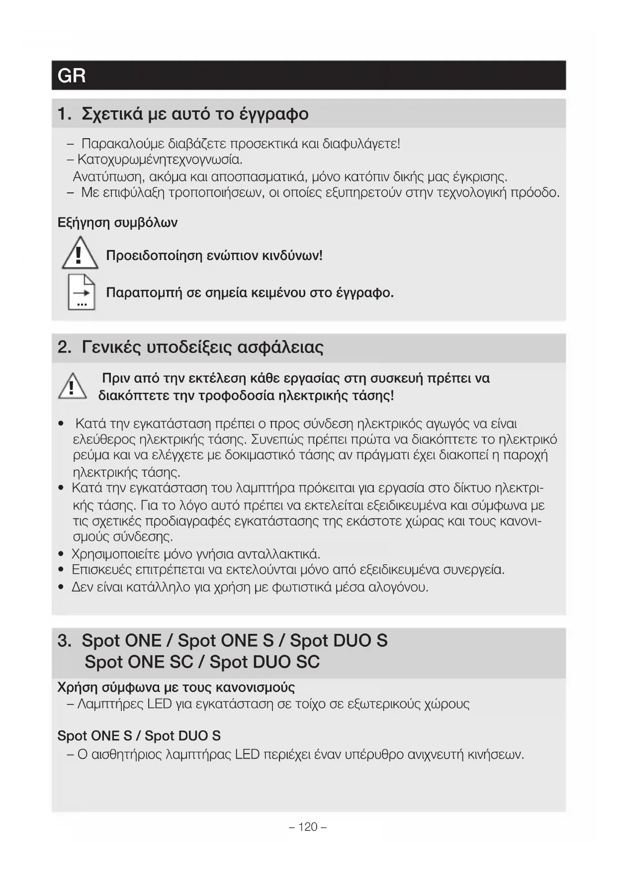 Spot ONESC / Spot DUO SC Χρήση σύμφωνα με τους κανονισμούς – Λαμπτήρες LED για εγκατάσταση σε τοίχο σε εξωτερικούς χώρους Spot ONES / Spot DUOS – Ο αισθητήριος λαμπτήρας LED περιέχει έναν υπέρυθρο ανιχνευτή κινήσεων.– 121 – Spot ONESC / Spot DUOSC – Ο αισθητήριος λαμπτήρας LED περιέχει έναν υπέρυθρο ανιχνευτή κινήσεων και ρυθμίζεται μόνο μέσω Bluetooth. Χρήση όχι σύμφωνα με τους κανονισμούς – Ο προβολέας LED δεν διαθέτει ρεοστατική ρύθμιση. Χωρίς ρεοστατική