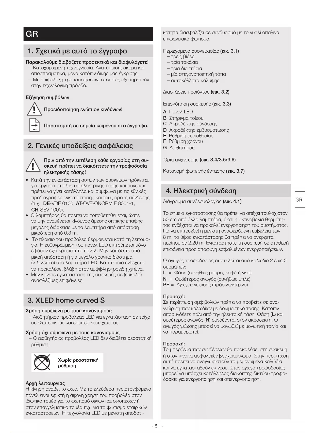 Προειδοποίηση ενώπιον κινδύνων! Παραπομπή σε σημεία κειμένου στο έγγραφο 2 Γενικές υποδείξεις ασφάλειας Πριν από την εκτέλεση κάθε εργασίας στη συ-σκευή πρέπει να διακόπτετε την τροφοδοσία ηλεκτρικής τάσης! • Κατά την εγκατάσταση αυτών των συσκευών πρόκειται για εργασία στο δίκτυο ηλεκτρικής τάσης και συνεπώς πρέπει να γίνει κατάλληλα και σύμφωνα με τις εθνικές προδιαγραφές εγκατάστασης και τους όρους σύνδεσης (π.χ.: DE-VDE 0100, AT-ÖVE/ÖNORM E 8001-1, CH-SEV 1000).• Ο λαμπτήρας θα πρέπει να τοποθετηθεί έτσι, ώστε να μην αναμένεται κίνδυνος άμεσης οπτικής επαφής μεγάλης διάρκειας με το λαμπτήρα από απόσταση μικρότερη από 0,3m.• Το πλαίσιο του προβολέα θερμαίνεται κατά τη λειτουρ-γία. Η ευθυγράμμιση του πάνελ LED επιτρέπεται μόνο εφόσον έχει κρυώσει το πάνελ. Μην κοιτάζετε από μικρή απόσταση ή για μεγάλο χρονικό διάστημα (> 5 λεπτά) στο λαμπτήρα LED. Κάτι τέτοιο ενδέχεται να προκαλέσει βλάβη στον αμφιβληστροειδή χιτώνα.• Μην κάνετε εγκατάσταση της συσκευής σε (εύκολα) αναφλέξιμες επιφάνειες. 3 XLED home curved S Χρήση σύμφωνα με τους κανονισμούς – Αισθητήριος προβολέας LED για εγκατάσταση σε τοίχο σε εξωτερικούς και εσωτερικούς χώρουςΧρήση όχι σύμφωνα με τους κανονισμούς – Ο αισθητήριος προβολέας LED δεν διαθέτει ρεοστατική ρύθμιση.Χωρίς ρεοστατική ρύθμισηAρχή λειτουργίαςΗ κίνηση ανάβει το φως. Με το ελεύθερα περιστρεφόμενο πάνελ είναι εφικτή η άψογη χρήση του προβολέα στον ιδιωτικό τομέα για το φωτισμό οικιών και οικοπέδων ή στον επαγγελματικό τομέα π.χ. για το φωτισμό εταιρικών εγκαταστάσεων. Η τεχνολογία LED με μέγιστη αποδοτι-