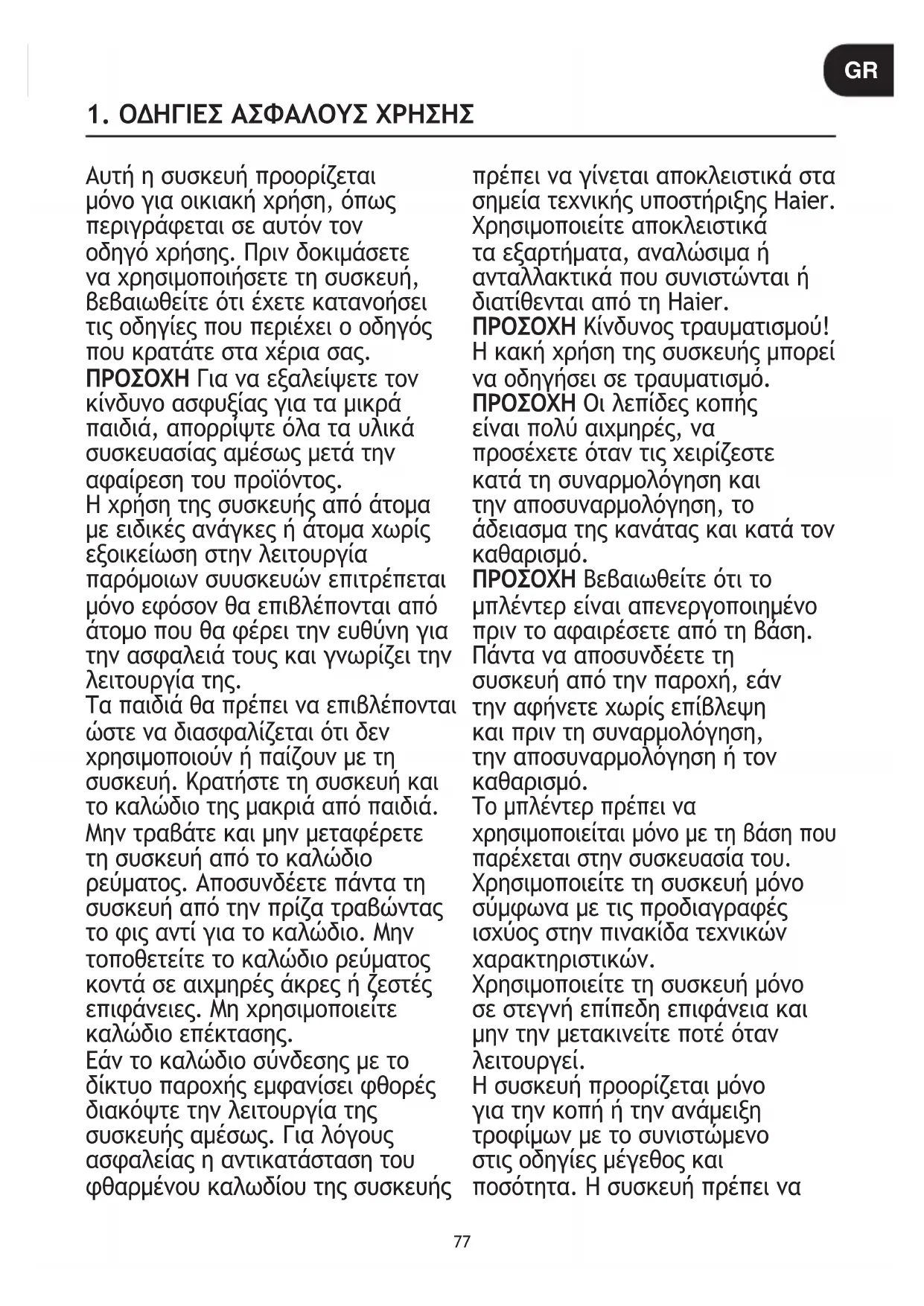 GR78 χρησιμοποιείται αποκλειστικά για την προβλεπόμενη χρήση. Μη χρησιμοποιείτε την γυάλινη κανάτα αμέσως αφού τη βγάλετε από το πλυντήριο πιάτων ή το ψυγείο. Βεβαιωθείτε ότι θα έχει παραμείνει σε θερμοκρασία δωματίου για τουλάχιστον 5 λεπτά πριν τη χρήση. Μη λειτουργείτε τη συσκευή έως ότου η μονάδα λεπίδων στερεωθεί καλά και το καπάκι τοποθετηθεί σωστά στην κανάτα του μπλέντερ. Προσέξτε εάν χυθεί καυτό υγρό στο μπλέντερ γιατί μπορεί να εκτοξευθεί έξω από τη συσκευή λόγω ξαφνικής δημιουργίας ατμού. Ποτέ μην γεμίζετε την κανάτα του μπλέντερ με υλικά σε υψηλότερη θερμοκρασία από 70°C. Απενεργοποιήστε τη συσκευή και αποσυνδέστε την από την παροχή ρεύματος πριν αλλάξετε αξεσουάρ ή πλησιάσετε εξαρτήματα που κινούνται κατά τη χρήση. Μην βάζετε ποτέ τα δάχτυλά σας στην κανάτα του μπλέντερ για να αγγίξετε τις αιχμηρές λεπίδες ή να αφαιρέσετε τα συστατικά όταν η συσκευή είναι συνδεδεμένη στην πρίζα. Μην βάζετε ποτέ τα δάχτυλά σας ή ένα αντικείμενο όπως πχ σπάτουλες, στην κανάτα του μπλέντερ ενώ η συσκευή λειτουργεί. Εάν κάποια συστατικά κολλήσουν στα πλαϊνά της κανάτας του μπλέντερ, απενεργοποιήστε και αποσυνδέστε τη συσκευή από την πρίζα και, στη συνέχεια, χρησιμοποιήστε την παρεχόμενη σπάτουλα για να αφαιρέσετε τα συστατικά από τα πλαϊνά. Αποσυνδέστε την από την παροχή ρεύματος και αφήστε τις λεπίδες κοπής να σταματήσουν εντελώς πριν αφαιρέσετε τυχόν εξαρτήματα και πριν καθαρίσετε ή κάνετε οποιαδήποτε συντήρηση. Ποτέ μην βυθίζετε τη βάση του κινητήρα σε υγρό. Μη λειτουργείτε τη συσκευή με βρεγμένα χέρια. Προσοχή σε καθαρές επιφάνειες που προορίζονται να έρθουν σε επαφή με τρόφιμα! Κρατήστε σημειώσεις και ακολουθείτε πιστά για τον καθαρισμό τις οδηγίες χρήσης. Εάν η συσκευή εμφανίσει κάποια βλάβη μην συνεχίσετε να την χρησιμοποιείτε. Τεχνική Υποστήριξη Haier: Για την διατήρηση της ασφαλούς και αποτελεσματικής λειτουργίας της συσκευής οι επεμβάσεις συντήρησης και αποκατάστασης βλαβών πρέπει να γίνονται αποκλειστικά μέσω των εξουσιοδοτημένων τεχνικών Haier.