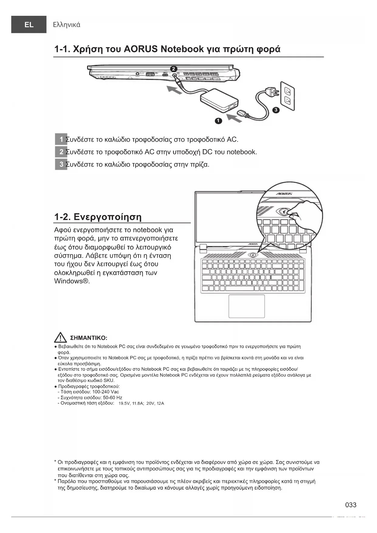 ● Βεβαιωθείτε ότι το Notebook PC σας είναι συνδεδεμένο σε γειωμένο τροφοδοτικό πριν το ενεργοποιήσετε για πρώτη φορά.● Όταν χρησιμοποιείτε το Notebook PC σας με τροφοδοτικό, η πρίζα πρέπει να βρίσκεται κοντά στη μονάδα και να είναι εύκολα προσβάσιμη.● Εντοπίστε το σήμα εισόδου/εξόδου στο Notebook PC σας και βεβαιωθείτε ότι ταιριάζει με τις πληροφορίες εισόδου/εξόδου στο τροφοδοτικό σας. Ορισμένα μοντέλα Notebook PC ενδέχεται να έχουν πολλαπλά ρεύματα εξόδου ανάλογα με τον διαθέσιμο κωδικό SKU.● Προδιαγραφές τροφοδοτικού: - Τάση εισόδου: 100-240 Vac - Συχνότητα εισόδου: 50-60 Hz - Ονομαστική τάση εξόδου: 19.5V, 11.8A; 20V, 12A