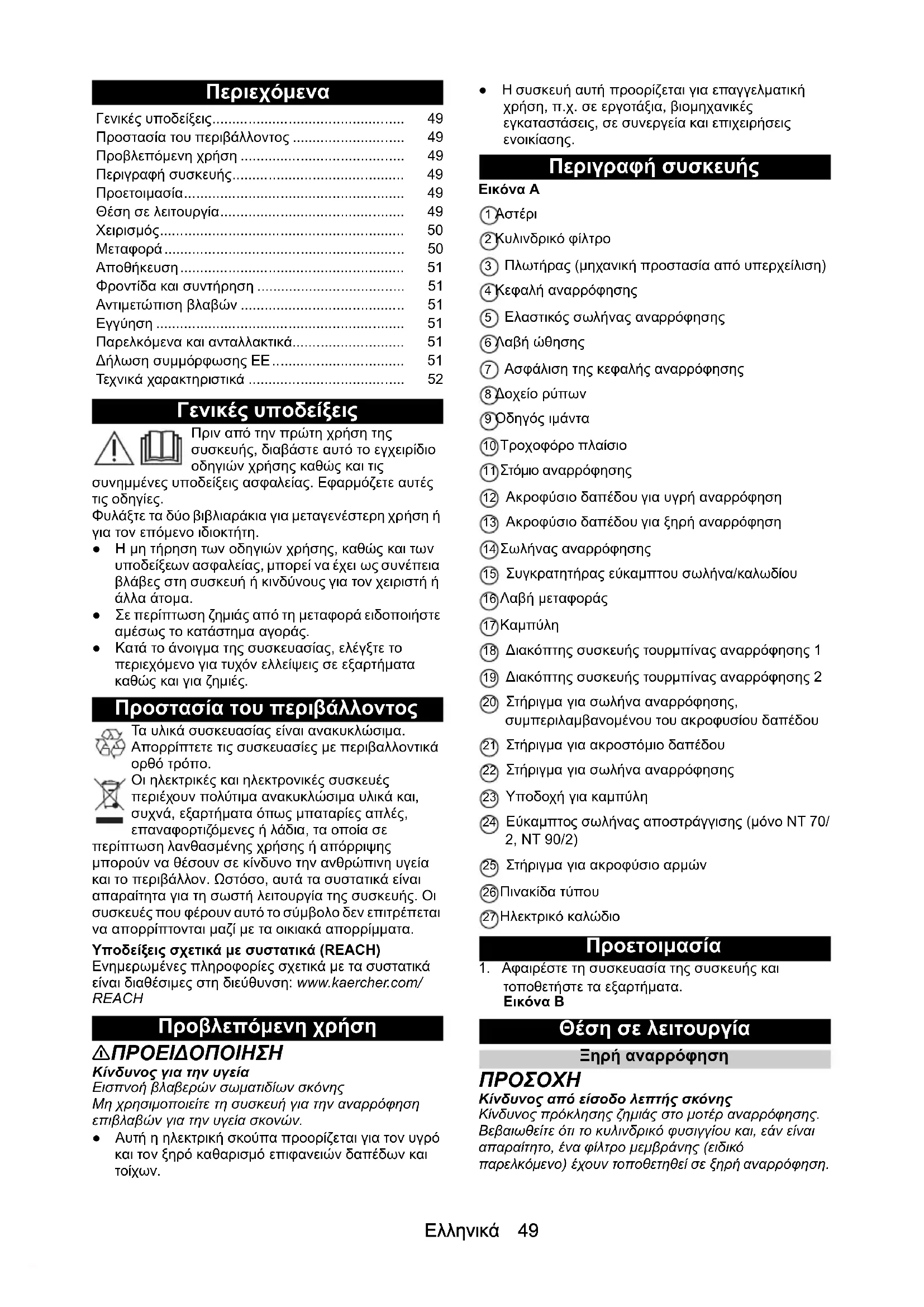 H05VV-F 2x1,0 H05VV-F 2x1,0 H05VV-F 2x1,0 Osanumero (EU) 9.770-933.0 9.770-933.0 9.770-933.0 Kaapelin pituus m 7,5 7,5 7,5Ελληνικά 49 Περιεχόμενα Γενικές υποδείξεις Πριν από την πρώτη χρήση της συσκευής, διαβάστε αυτό το εγχειρίδιο οδηγιών χρήσης καθώς και τις συνημμένες υποδείξεις ασφαλείας. Εφαρμόζετε αυτές τις οδηγίες. Φυλάξτε τα δύο βιβλιαράκια για μεταγενέστερη χρήση ή για τον επόμενο ιδιοκτήτη. ●Η μη τήρηση των οδηγιών χρήσης, καθώς και των υποδείξεων ασφαλείας, μπορεί να έχει ως συνέπεια βλάβες στη συσκευή ή κινδύνους για τον χειριστή ή άλλα άτομα. ●Σε περίπτωση ζημιάς από τη μεταφορά ειδοποιήστε αμέσως το κατάστημα αγοράς. ●Κατά το άνοιγμα της συσκευασίας, ελέγξτε το περιεχόμενο για τυχόν ελλείψεις σε εξαρτήματα καθώς και για ζημιές. Προστασία του περιβάλλοντος Τα υλικά συσκευασίας είναι ανακυκλώσιμα. Απορρίπτετε τις συσκευασίες με περιβαλλοντικά ορθό τρόπο. Οι ηλεκτρικές και ηλεκτρονικές συσκευές περιέχουν πολύτιμα ανακυκλώσιμα υλικά και, συχνά, εξαρτήματα όπως μπαταρίες απλές, επαναφορτιζόμενες ή λάδια, τα οποία σε περίπτωση λανθασμένης χρήσης ή απόρριψης μπορούν να θέσουν σε κίνδυνο την ανθρώπινη υγεία και το περιβάλλον. Ωστόσο, αυτά τα συστατικά είναι απαραίτητα για τη σωστή λειτουργία της συσκευής. Οι συσκευές που φέρουν αυτό το σύμβολο δεν επιτρέπεται να απορρίπτονται μαζί με τα οικιακά απορρίμματα. Υποδείξεις σχετικά με συστατικά (REACH) Ενημερωμένες πληροφορίες σχετικά με τα συστατικά είναι διαθέσιμες στη διεύθυνση: www.kaercher.com/ REACH Προβλεπόμενη χρήση 몇 ΠΡΟΕΙΔΟΠΟΙΗΣΗ Κίνδυνος για την υγεία Εισπνοή βλαβερών σωματιδίων σκόνης Μη χρησιμοποιείτε τη συσκευή για την αναρρόφηση επιβλαβών για την υγεία σκονών. ●Αυτή η ηλεκτρική σκούπα προορίζεται για τον υγρό και τον ξηρό καθαρισμό επιφανειών δαπέδων και