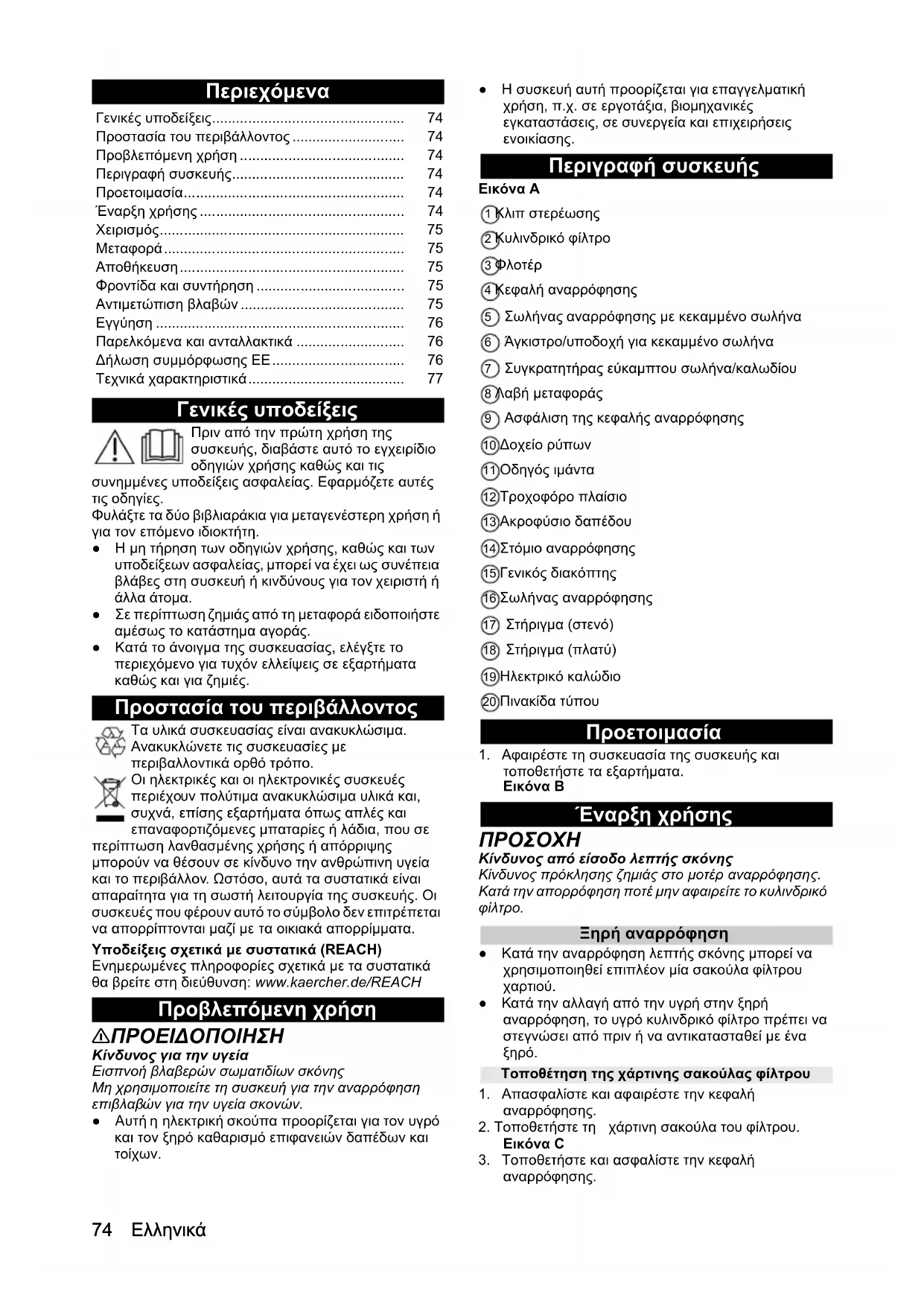 H05VV-F 2x1,0 H05VV-F 2x1,0 H05VV-F 2x1,0 Broj dela (EU) 9.770-820.0 9.770-820.0 9.770-820.0 Dužina kabla m 6,5 6,5 6,574 Ελληνικά Περιεχόμενα Γενικές υποδείξεις Πριν από την πρώτη χρήση της συσκευής, διαβάστε αυτό το εγχειρίδιο οδηγιών χρήσης καθώς και τις συνημμένες υποδείξεις ασφαλείας. Εφαρμόζετε αυτές τις οδηγίες. Φυλάξτε τα δύο βιβλιαράκια για μεταγενέστερη χρήση ή για τον επόμενο ιδιοκτήτη. ●Η μη τήρηση των οδηγιών χρήσης, καθώς και των υποδείξεων ασφαλείας, μπορεί να έχει ως συνέπεια βλάβες στη συσκευή ή κινδύνους για τον χειριστή ή άλλα άτομα. ●Σε περίπτωση ζημιάς από τη μεταφορά ειδοποιήστε αμέσως το κατάστημα αγοράς. ●Κατά το άνοιγμα της συσκευασίας, ελέγξτε το περιεχόμενο για τυχόν ελλείψεις σε εξαρτήματα καθώς και για ζημιές. Προστασία του περιβάλλοντος Τα υλικά συσκευασίας είναι ανακυκλώσιμα. Ανακυκλώνετε τις συσκευασίες με περιβαλλοντικά ορθό τρόπο. Οι ηλεκτρικές και οι ηλεκτρονικές συσκευές περιέχουν πολύτιμα ανακυκλώσιμα υλικά και, συχνά, επίσης εξαρτήματα όπως απλές και επαναφορτιζόμενες μπαταρίες ή λάδια, που σε περίπτωση λανθασμένης χρήσης ή απόρριψης μπορούν να θέσουν σε κίνδυνο την ανθρώπινη υγεία και το περιβάλλον . Ωστόσο, αυτά τα συστατικά είναι απαραίτητα για τη σωστή λειτουργία της συσκευής. Οι συσκευές που φέρουν αυτό το σύμβολο δεν επιτρέπεται να απορρίπτονται μαζί με τα οικιακά απορρίμματα. Υποδείξεις σχετικά με συστατικά (REACH) Ενημερωμένες πληροφορίες σχετικά με τα συστατικά θα βρείτε στη διεύθυνση: www.kaercher.de/REACH Προβλεπόμενη χρήση 몇 ΠΡΟΕΙΔΟΠΟΙΗΣΗ Κίνδυνος για την υγεία Εισπνοή βλαβερών σωματιδίων σκόνης Μη χρησιμοποιείτε τη συσκευή για την αναρρόφηση επιβλαβών για την υγεία σκονών. ●Αυτή η ηλεκτρική σκούπα προορίζεται για τον υγρό και τον ξηρό καθαρισμό επιφανειών δαπέδων και