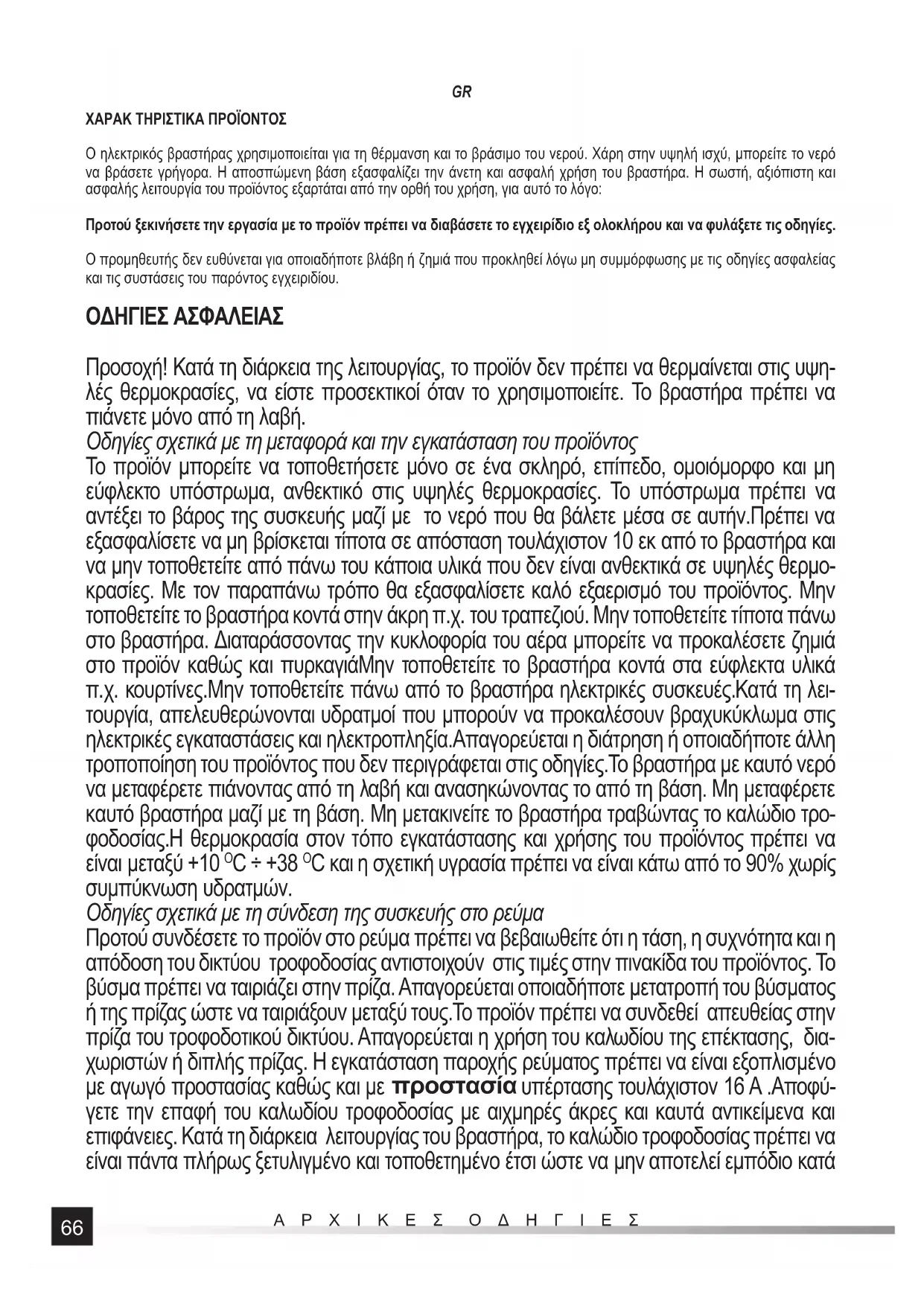 ΧΑΡΑΚ ΤΗΡΙΣΤΙΚΑ ΠΡΟΪΟΝΤΟΣ Ο ηλεκτρικός βραστήρας χρησιμοποιείται για τη θέρμανση και το βράσιμο του νερού. Χάρη στην υψηλή ισχύ, μπορείτε το νερό να βράσετε γρήγορα. Η αποσπώμενη βάση εξασφαλίζει την άνετη και ασφαλή χρήση του βραστήρα. Η σωστή, αξιόπιστη και ασφαλής λειτουργία του προϊόντος εξαρτάται από την ορθή του χρήση, για αυτό το λόγο: Προτού ξεκινήσετε την εργασία με το προϊόν πρέπει να διαβάσετε το εγχειρίδιο εξ ολοκλήρου και να φυλάξετε τις οδηγίες. Ο προμηθευτής δεν ευθύνεται για οποιαδήποτε βλάβη ή ζημιά που προκληθεί λόγω μη συμμόρφωσης με τις οδηγίες ασφαλείας και τις συστάσεις του παρόντος εγχειριδίου. ΟΔΗΓΙΕΣ ΑΣΦΑΛΕΙΑΣ Προσοχή! Κατά τη διάρκεια της λειτουργίας, το προϊόν δεν πρέπει να θερμαίνεται στις υψη- λές θερμοκρασίες, να είστε προσεκτικοί όταν το χρησιμοποιείτε. Το βραστήρα πρέπει να πιάνετε μόνο από τη λαβή. Οδηγίες σχετικά με τη μεταφορά και την εγκατάσταση του προϊόντος Το προϊόν μπορείτε να τοποθετήσετε μόνο σε ένα σκληρό, επίπεδο, ομοιόμορφο και μη εύφλεκτο υπόστρωμα, ανθεκτικό στις υψηλές θερμοκρασίες. Το υπόστρωμα πρέπει να αντέξει το βάρος της συσκευής μαζί με το νερό που θα βάλετε μέσα σε αυτήν.Πρέπει να εξασφαλίσετε να μη βρίσκεται τίποτα σε απόσταση τουλάχιστον 10 εκ από το βραστήρα και να μην τοποθετείτε από πάνω του κάποια υλικά που δεν είναι ανθεκτικά σε υψηλές θερμο- κρασίες. Με τον παραπάνω τρόπο θα εξασφαλίσετε καλό εξαερισμό του προϊόντος. Μην τοποθετείτε το βραστήρα κοντά στην άκρη π.χ. του τραπεζιού. Μην τοποθετείτε τίποτα πάνω στο βραστήρα. Διαταράσσοντας την κυκλοφορία του αέρα μπορείτε να προκαλέσετε ζημιά στο προϊόν καθώς και πυρκαγιάΜην τοποθετείτε το βραστήρα κοντά στα εύφλεκτα υλικά π.χ. κουρτίνες.Μην τοποθετείτε πάνω από το βραστήρα ηλεκτρικές συσκευές.Κατά τη λει- τουργία, απελευθερώνονται υδρατμοί που μπορούν να προκαλέσουν βραχυκύκλωμα στις ηλεκτρικές εγκαταστάσεις και ηλεκτροπληξία.Απαγορεύεται η διάτρηση ή οποιαδήποτε άλλη τροποποίηση του προϊόντος που δεν περιγράφεται στις οδηγίες.Το βραστήρα με καυτό νερό να μεταφέρετε πιάνοντας από τη λαβή και ανασηκώνοντας το από τη βάση. Μη μεταφέρετε καυτό βραστήρα μαζί με τη βάση. Μη μετακινείτε το βραστήρα τραβώντας το καλώδιο τρο- φοδοσίας.Η θερμοκρασία στον τόπο εγκατάστασης και χρήσης του προϊόντος πρέπει να είναι μεταξύ +10