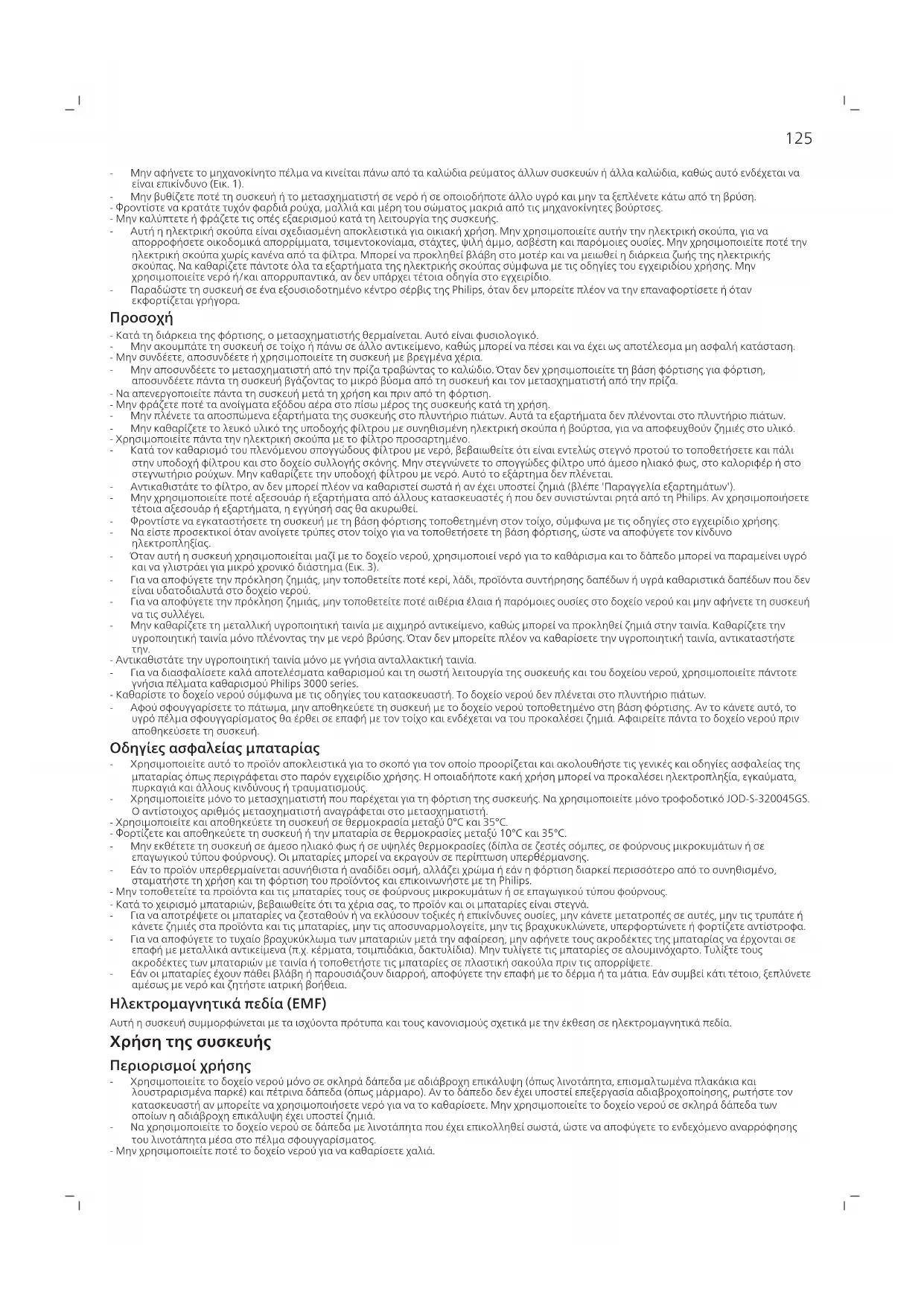 - Αντικαθιστάτε την υγροποιητική ταινία μόνο με γνήσια ανταλλακτική ταινία. - Για να διασφαλίσετε καλά αποτελέσματα καθαρισμού και τη σωστή λειτουργία της συσκευής και του δοχείου νερού, χρησιμοποιείτε πάντοτε γνήσια πέλματα καθαρισμού Philips 3000 series. - Καθαρίστε το δοχείο νερού σύμφωνα με τις οδηγίες του κατασκευαστή. Το δοχείο νερού δεν πλένεται στο πλυντήριο πιάτων. - Αφού σφουγγαρίσετε το πάτωμα, μην αποθηκεύετε τη συσκευή με το δοχείο νερού τοποθετημένο στη βάση φόρτισης. Αν το κάνετε αυτό, το υγρό πέλμα σφουγγαρίσματος θα έρθει σε επαφή με τον τοίχο και ενδέχεται να του προκαλέσει ζημιά. Αφαιρείτε πάντα το δοχείο νερού πριν αποθηκεύσετε τη συσκευή. Οδηγίες ασφαλείας μπαταρίας - Χρησιμοποιείτε αυτό το προϊόν αποκλειστικά για το σκοπό για τον οποίο προορίζεται και ακολουθήστε τις γενικές και οδηγίες ασφαλείας της μπαταρίας όπως περιγράφεται στο παρόν εγχειρίδιο χρήσης. Η οποιαδήποτε κακή χρήση μπορεί να προκαλέσει ηλεκτροπληξία, εγκαύματα, πυρκαγιά και άλλους κινδύνους ή τραυματισμούς. - Χρησιμοποιείτε μόνο το μετασχηματιστή που παρέχεται για τη φόρτιση της συσκευής. Να χρησιμοποιείτε μόνο τροφοδοτικό JOD-S-320045GS. Ο αντίστοιχος αριθμός μετασχηματιστή αναγράφεται στο μετασχηματιστή. - Χρησιμοποιείτε και αποθηκεύετε τη συσκευή σε θερμοκρασία μεταξύ 0°C και 35°C. - Φορτίζετε και αποθηκεύετε τη συσκευή ή την μπαταρία σε θερμοκρασίες μεταξύ 10°C και 35°C. - Μην εκθέτετε τη συσκευή σε άμεσο ηλιακό φως ή σε υψηλές θερμοκρασίες (δίπλα σε ζεστές σόμπες, σε φούρνους μικροκυμάτων ή σε επαγωγικού τύπου φούρνους). Οι μπαταρίες μπορεί να εκραγούν σε περίπτωση υπερθέρμανσης. - Εάν το προϊόν υπερθερμαίνεται ασυνήθιστα ή αναδίδει οσμή, αλλάζει χρώμα ή εάν η φόρτιση διαρκεί περισσότερο από το συνηθισμένο, σταματήστε τη χρήση και τη φόρτιση του προϊόντος και επικοινωνήστε με τη Philips. - Μην τοποθετείτε τα προϊόντα και τις μπαταρίες τους σε φούρνους μικροκυμάτων ή σε επαγωγικού τύπου φούρνους. - Κατά το χειρισμό μπαταριών, βεβαιωθείτε ότι τα χέρια σας, το προϊόν και οι μπαταρίες είναι στεγνά. - Για να αποτρέψετε οι μπαταρίες να ζεσταθούν ή να εκλύσουν τοξικές ή επικίνδυνες ουσίες, μην κάνετε μετατροπές σε αυτές, μην τις τρυπάτε ή κάνετε ζημιές στα προϊόντα και τις μπαταρίες, μην τις αποσυναρμολογείτε, μην τις βραχυκυκλώνετε, υπερφορτώνετε ή φορτίζετε αντίστροφα. - Για να αποφύγετε το τυχαίο βραχυκύκλωμα των μπαταριών μετά την αφαίρεση, μην αφήνετε τους ακροδέκτες της μπαταρίας να έρχονται σε επαφή με μεταλλικά αντικείμενα (π.χ. κέρματα, τσιμπιδάκια, δακτυλίδια). Μην τυλίγετε τις μπαταρίες σε αλουμινόχαρτο. Τυλίξτε τους ακροδέκτες των μπαταριών με ταινία ή τοποθετήστε τις μπαταρίες σε πλαστική σακούλα πριν τις απορρίψετε. - Εάν οι μπαταρίες έχουν πάθει βλάβη ή παρουσιάζουν διαρροή, αποφύγετε την επαφή με το δέρμα ή τα μάτια. Εάν συμβεί κάτι τέτοιο, ξεπλύνετε αμέσως με νερό και ζητήστε ιατρική βοήθεια. Ηλεκτρομαγνητικά πεδία (EMF) Αυτή η συσκευή συμμορφώνεται με τα ισχύοντα πρότυπα και τους κανονισμούς σχετικά με την έκθεση σε ηλεκτρομαγνητικά πεδία. Χρήση της συσκευής Περιορισμοί χρήσης - Χρησιμοποιείτε το δοχείο νερού μόνο σε σκληρά δάπεδα με αδιάβροχη επικάλυψη (όπως λινοτάπητα, επισμαλτωμένα πλακάκια και λουστραρισμένα παρκέ) και πέτρινα δάπεδα (όπως μάρμαρο). Αν το δάπεδο δεν έχει υποστεί επεξεργασία αδιαβροχοποίησης, ρωτήστε τον κατασκευαστή αν μπο