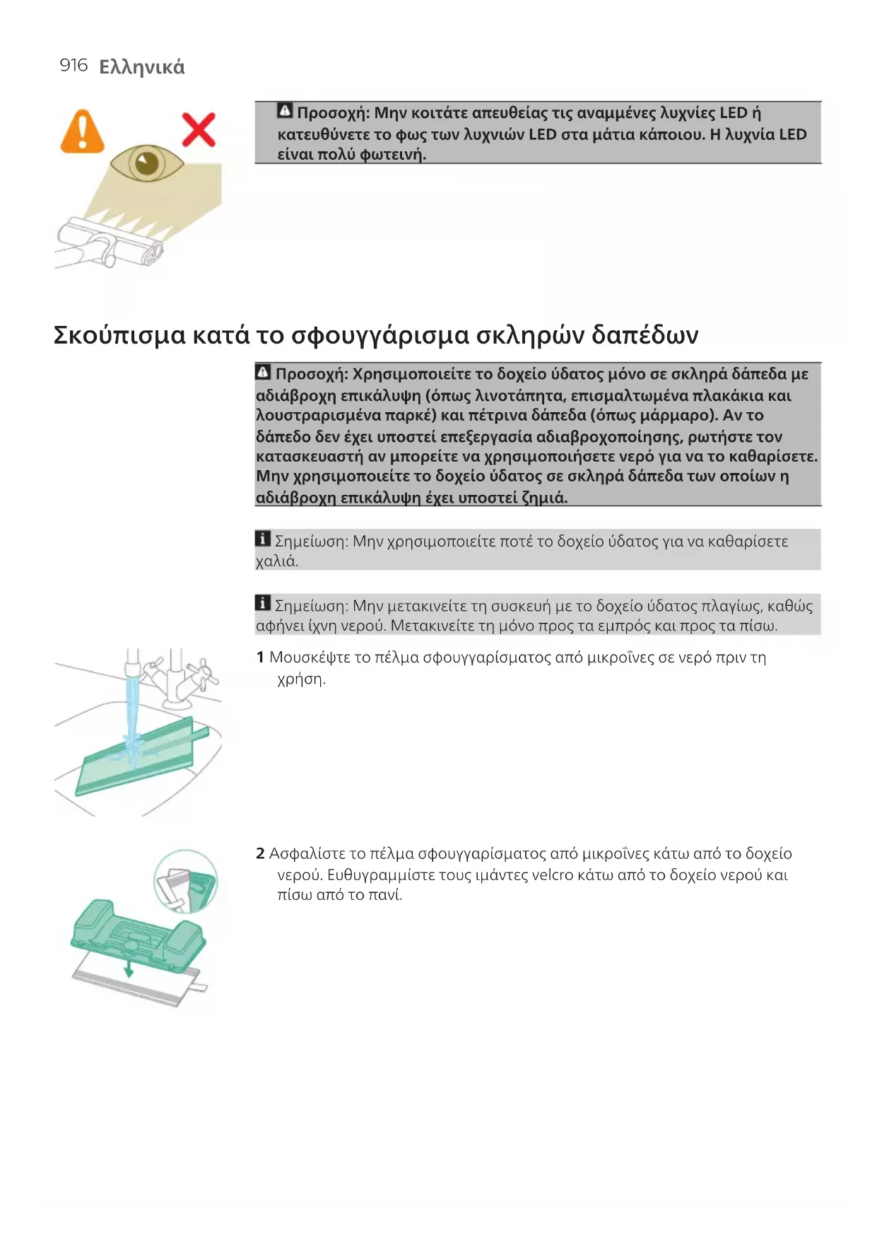 Προσοχή: Μην κοιτάτε απευθείας τις αναμμένες λυχνίες LED ή κατευθύνετε το φως των λυχνιών LED στα μάτια κάποιου. Η λυχνία LED είναι πολύ φωτεινή. Σκούπισμα κατά το σφουγγάρισμα σκληρών δαπέδων Προσοχή: Χρησιμοποιείτε το δοχείο ύδατος μόνο σε σκληρά δάπεδα με αδιάβροχη επικάλυψη (όπως λινοτάπητα, επισμαλτωμένα πλακάκια και λουστραρισμένα παρκέ) και πέτρινα δάπεδα (όπως μάρμαρο). Αν το δάπεδο δεν έχει υποστεί επεξεργασία αδιαβροχοποίησης, ρωτήστε τον κατασκευαστή αν μπορείτε να χρησιμοποιήσετε νερό για να το καθαρίσετε. Μην χρησιμοποιείτε το δοχείο ύδατος σε σκληρά δάπεδα των οποίων η αδιάβροχη επικάλυψη έχει υποστεί ζημιά. Σημείωση: Μην χρησιμοποιείτε ποτέ το δοχείο ύδατος για να καθαρίσετε
