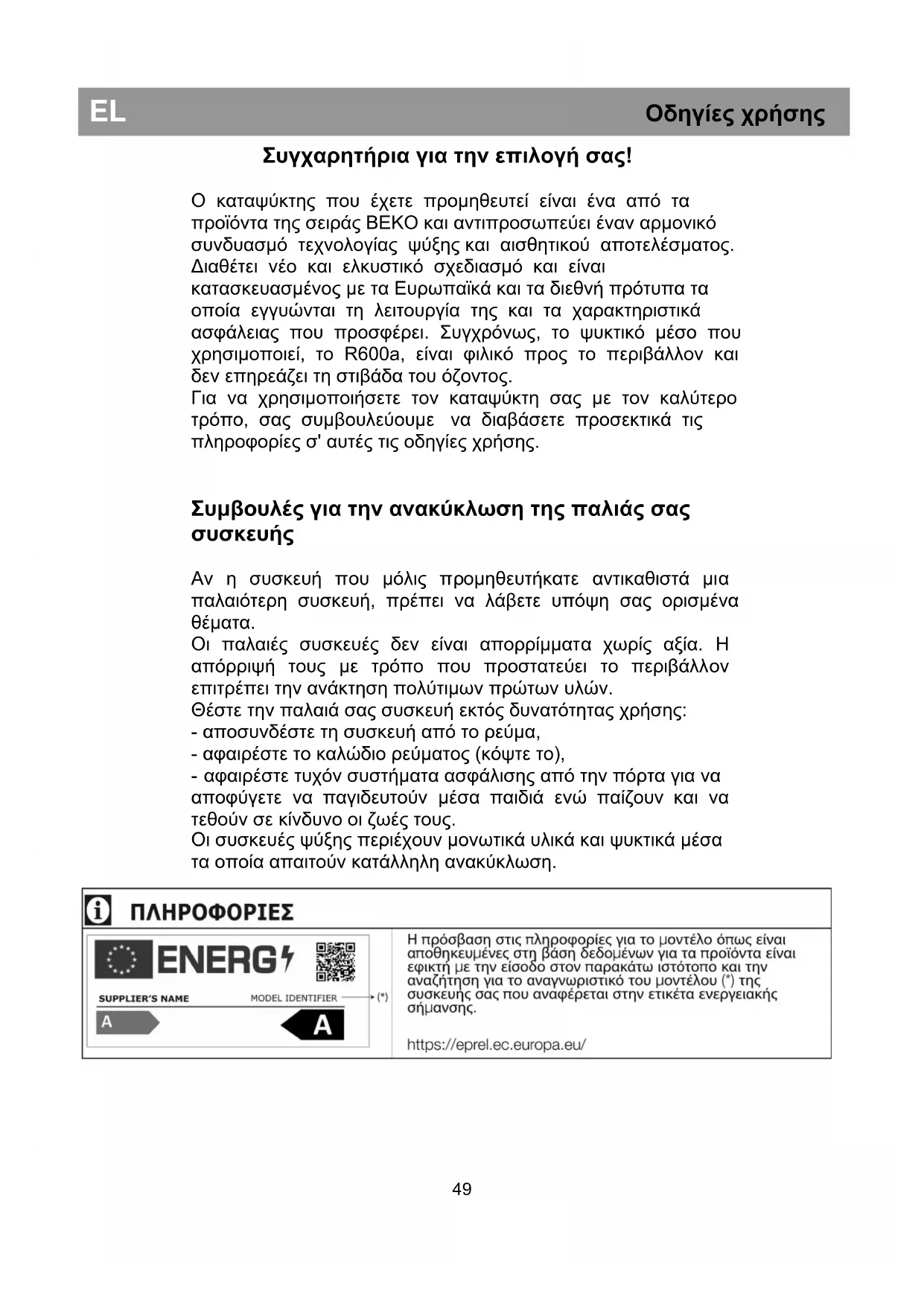 o ambiente y la salud humana debido a la presencia de ciertas sustancias.Συγχαρητήρια για την επιλογή σας! Ο καταψύκτης που έχετε προμηθευτεί είναι ένα από τα προϊόντα της σειράς BEKO και αντιπροσωπεύει έναν αρμονικό συνδυασμό τεχνολογίας ψύξης και αισθητικού αποτελέσματος. Διαθέτει νέο και ελκυστικό σχεδιασμό και είναι κατασκευασμένος με τα Ευρωπαϊκά και τα διεθνή πρότυπα τα οποία εγγυώνται τη λειτουργία της και τα χαρακτηριστικά ασφάλειας που προσφέρει. Συγχρόνως, το ψυκτικό μέσο που χρησιμοποιεί, το R600a, είναι φιλικό προς το περιβάλλον και δεν επηρεάζει τη στιβάδα του όζοντος. Για να χρησιμοποιήσετε τον καταψύκτη σας με τον καλύτερο τρόπο, σας συμβουλεύουμε να διαβάσετε προσεκτικά τις πληροφορίες σ' αυτές τις οδηγίες χρήσης. Συμβουλές για την ανακύκλωση της παλιάς σας