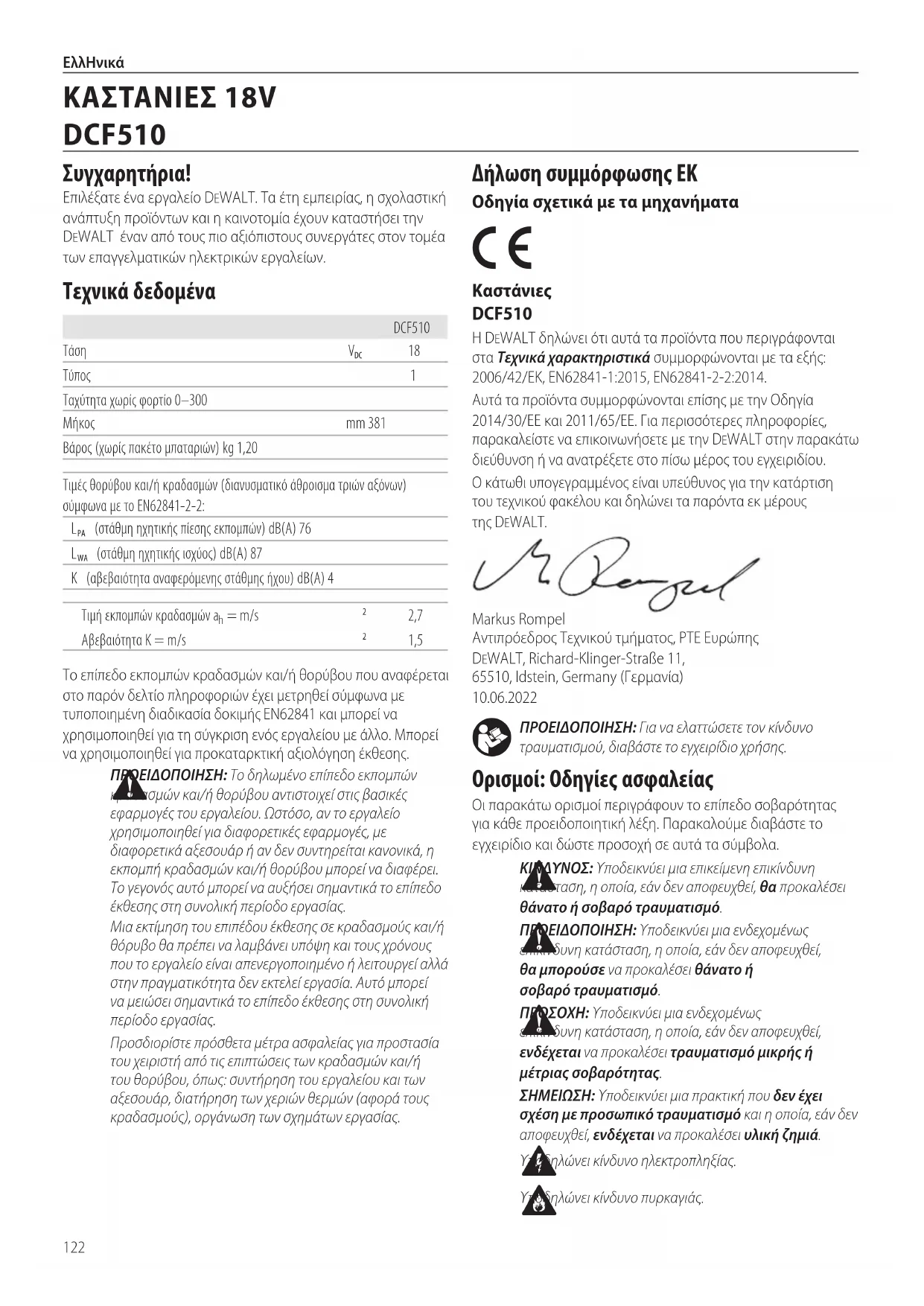 Υποδηλώνει κίνδυνοηλεκτροπληξίας. Υποδηλώνει κίνδυνοπυρκαγιάς. Δήλωση συμμόρφωσης ΕΚ Οδηγία σχετικά με τα μηχανήματα Καστάνιες DCF510 H DeWALT δηλώνει ότι αυτά τα προϊόντα που περιγράφονται στα Τεχνικά χαρακτηριστικά συμμορφώνονται με τα εξής: 2006/42/ΕΚ, EN62841‑1:2015, EN62841‑2‑2:2014.Αυτά τα προϊόντα συμμορφώνονται επίσης με την Οδηγία 2014/30/ΕΕ και 2011/65/ΕΕ. Για περισσότερες πληροφορίες, παρακαλείστε να επικοινωνήσετε με την DeWALT στην παρακάτω διεύθυνση ή να ανατρέξετε στο πίσω μέρος τουεγχειριδίου.Ο κάτωθι υπογεγραμμένος είναι υπεύθυνος για την κατάρτιση του τεχνικού φακέλου και δηλώνει τα παρόντα εκ μέρους τηςDeWALT.Markus Rompel Αντιπρόεδρος Τεχνικού τμήματος, PTE Ευρώπης DeWALT, Richard‑Klinger‑Straße 11, 65510, Idstein, Germany (Γερμανία) 10.06.2022Το επίπεδο εκπομπών κραδασμών και/ή θορύβου που αναφέρεται στο παρόν δελτίο πληροφοριών έχει μετρηθεί σύμφωνα με τυποποιημένη διαδικασία δοκιμής