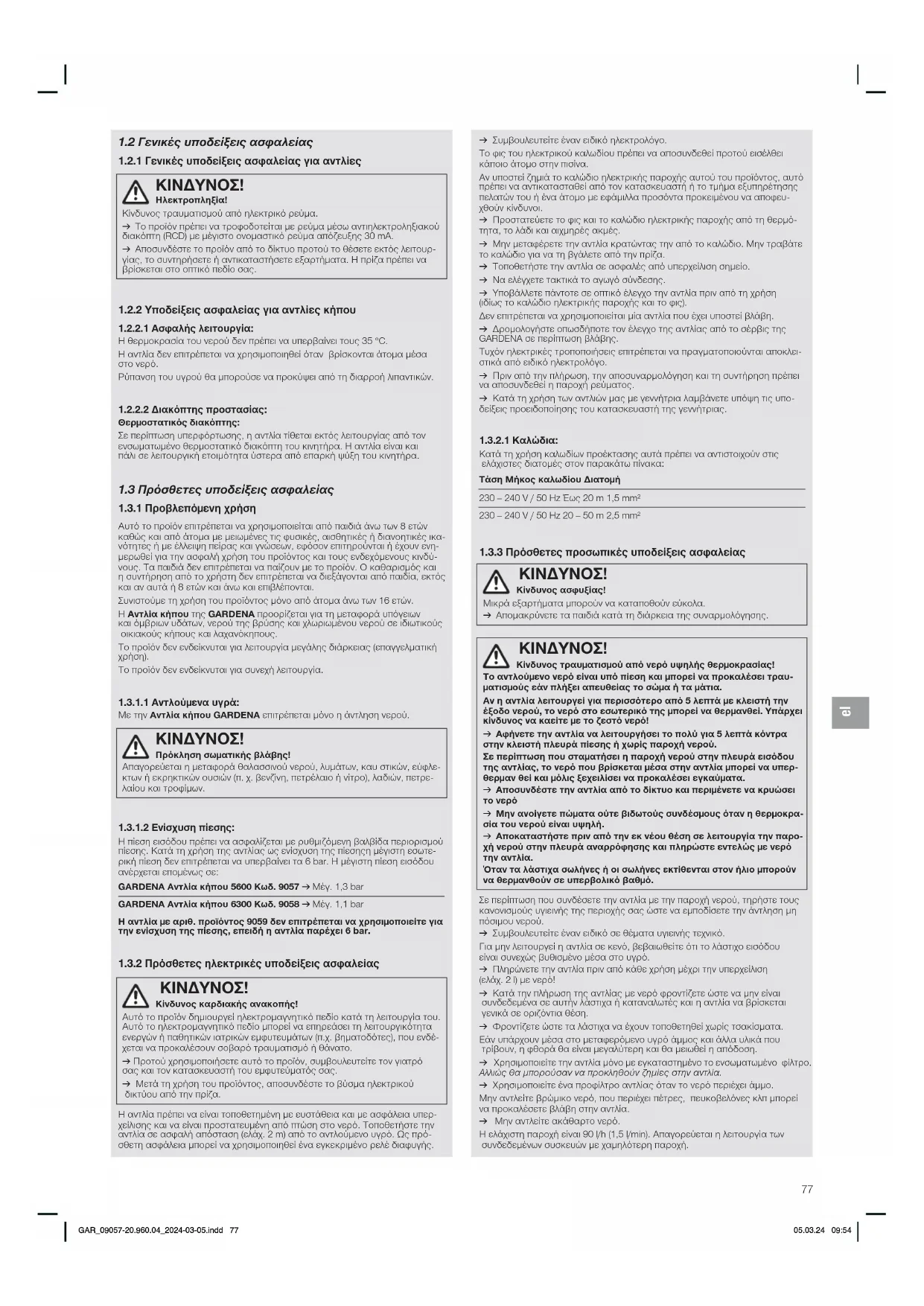 Κίνδυνος καρδιακής ανακοπής!Αυτό το προϊόν δημιουργεί ηλεκτρομαγνητικό πεδίο κατά τη λειτουργία του. Αυτό το ηλεκτρομαγνητικό πεδίο μπορεί να επηρεάσει τη λειτουργικότητα ενεργών ή παθητικών ιατρικών εμφυτευμάτων (π.χ. βηματοδότες), που ενδέ-χεται να προκαλέσουν σοβαρό τραυματισμό ή θάνατο.v Προτού χρησιμοποιήσετε αυτό το προϊόν, συμβουλευτείτε τον γιατρό σας και τον κατασκευαστή του εμφυτεύματός σας.v Μετά τη χρήση του προϊόντος, αποσυνδέστε το βύσμα ηλεκτρικού δικτύου από την πρίζα.Η αντλία πρέπει να είναι τοποθετημένη με ευστάθεια και με ασφάλεια υπερ-χείλισης και να είναι προστατευμένη από πτώση στο νερό. Τοποθετήστε την αντλία σε ασφαλή απόσταση (ελάχ. 2 m) από το αντλούμενο υγρό. Ως πρό-σθετη ασφάλεια μπορεί να χρησιμοποιηθεί ένα εγκεκριμένο ρελέ διαφυγής.v Συμβουλευτείτε έναν ειδικό ηλεκτρολόγο.Το φις του ηλεκτρικού καλωδίου πρέπει να αποσυνδεθεί προτού εισέλθει κάποιο άτομο στην πισίνα.Αν υποστεί ζημιά το καλώδιο ηλεκτρικής παροχής αυτού του προϊόντος, αυτό πρέπει να αντικατασταθεί από τον κατασκευαστή ή το τμήμα εξυπηρέτησης πελατών του ή ένα άτομο με εφάμιλλα προσόντα προκειμένου να αποφευ-χθούν κίνδυνοι.v Προστατεύετε το φις και το καλώδιο ηλεκτρικής παροχής από τη θερμό-τητα, το λάδι και αιχμηρές ακμές.v Μην μεταφέρετε την αντλία κρατώντας την από το καλώδιο. Μην τραβάτε το καλώδιο για να τη βγάλετε από την πρίζα.v Τοποθετήστε την αντλία σε ασφαλές από υπερχείλιση σημείο.v Να ελέγχετε τακτικά το αγωγό σύνδεσης.v Υποβάλλετε πάντοτε σε οπτικό έλεγχο την αντλία πριν από τη χρήση (ιδίως το καλώδιο ηλεκτρικής παροχής και το φις).Δεν επιτρέπεται να χρησιμοποιείται μία αντλία που έχει υποστεί βλάβη.v Δρομολογήστε οπωσδήποτε τον έλεγχο της αντλίας από το σέρβις της GARDENA σε περίπτωση βλάβης.Τυχόν ηλεκτρικές τροποποιήσεις επιτρέπεται να πραγματοποιούνται αποκλει-στικά από ειδικό ηλεκτρολόγο.v Πριν από την πλήρωση, την αποσυναρμολόγηση και τη συντήρηση πρέπει να αποσυνδεθεί η παροχή ρεύματος.v Κατά τη χρήση των αντλιών μας με γεννήτρια λαμβάνετε υπόψη τις υπο-δείξεις προειδοποίησης του κατασκευαστή της γεννήτριας.