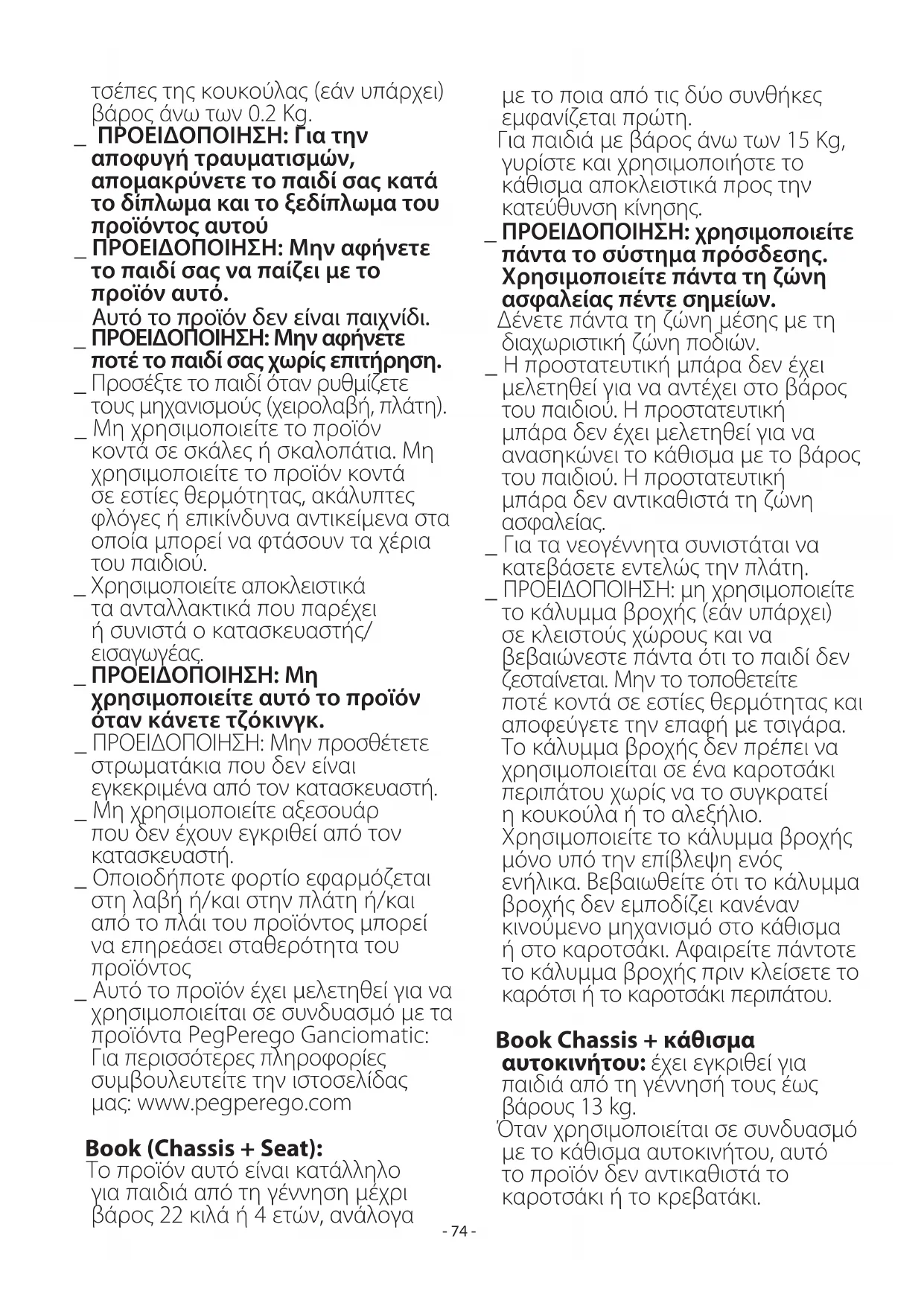 _ Αυτό το προϊόν έχει μελετηθεί για να χρησιμοποιείται σε συνδυασμό με τα προϊόντα PegPerego Ganciomatic: Για περισσότερες πληροφορίες συμβουλευτείτε την ιστοσελίδας μας: www.pegperego.com Book (Chassis + Seat): Το προϊόν αυτό είναι κατάλληλο για παιδιά από τη γέννηση μέχρι βάρος 22 κιλά ή 4 ετών, ανάλογα με το ποια από τις δύο συνθήκες εμφανίζεται πρώτη. Για παιδιά με βάρος άνω των 15Kg, γυρίστε και χρησιμοποιήστε το κάθισμα αποκλειστικά προς την κατεύθυνση κίνησης. _ ΠΡΟΕΙΔΟΠΟΙΗΣΗ: χρησιμοποιείτε πάντα το σύστημα πρόσδεσης. Χρησιμοποιείτε πάντα τη ζώνη ασφαλείας πέντε σημείων. Δένετε πάντα τη ζώνη μέσης με τη διαχωριστική ζώνη ποδιών. _ Η προστατευτική μπάρα δεν έχει μελετηθεί για να αντέχει στο βάρος του παιδιού. Η προστατευτική μπάρα δεν έχει μελετηθεί για να ανασηκώνει το κάθισμα με το βάρος του παιδιού. Η προστατευτική μπάρα δεν αντικαθιστά τη ζώνη