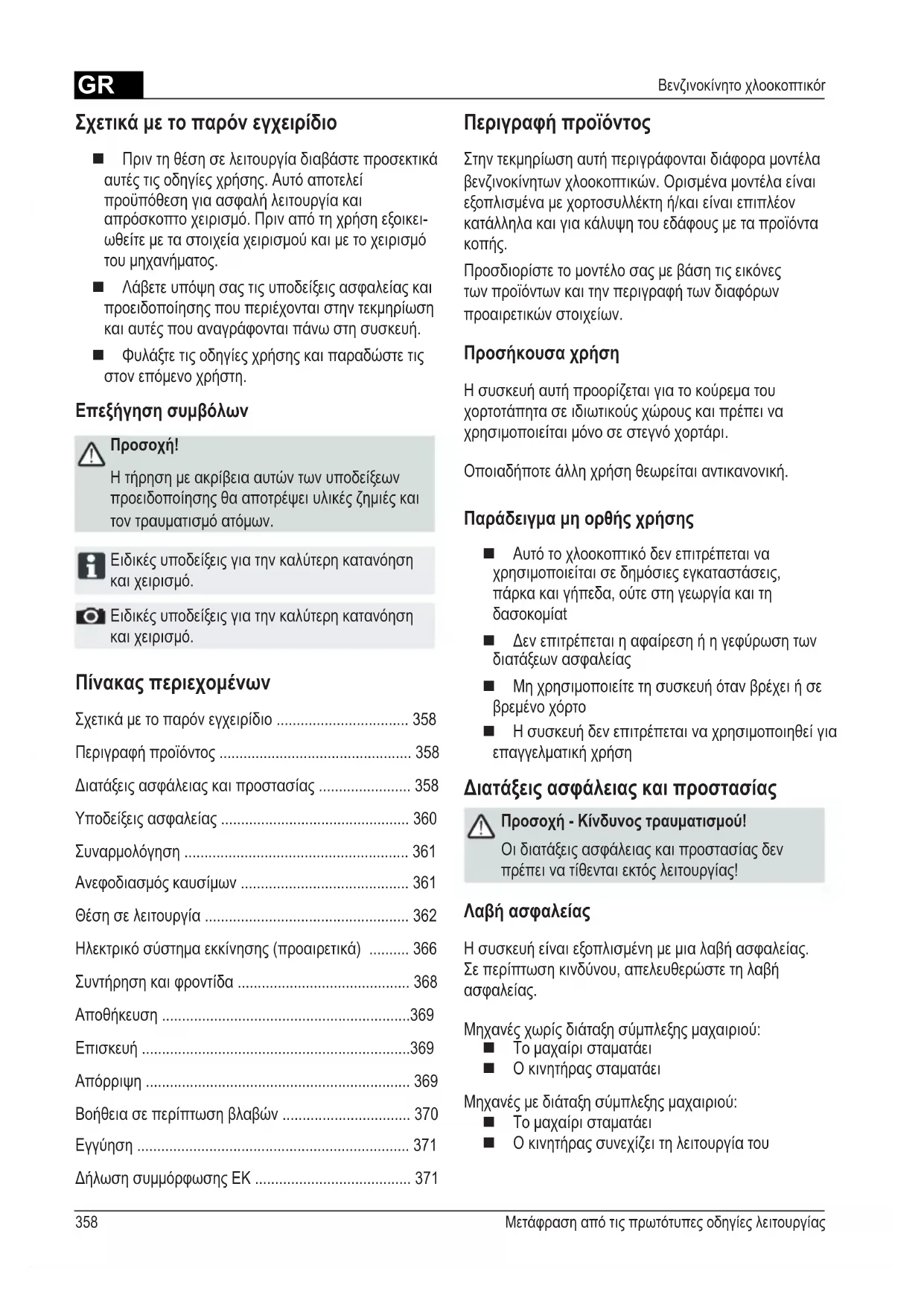 - Βενζινοκίνητο χλοοκοπτικόr Πίνακας περιεχομένων Σχετικά με το παρόν εγχειρίδιο p. 358