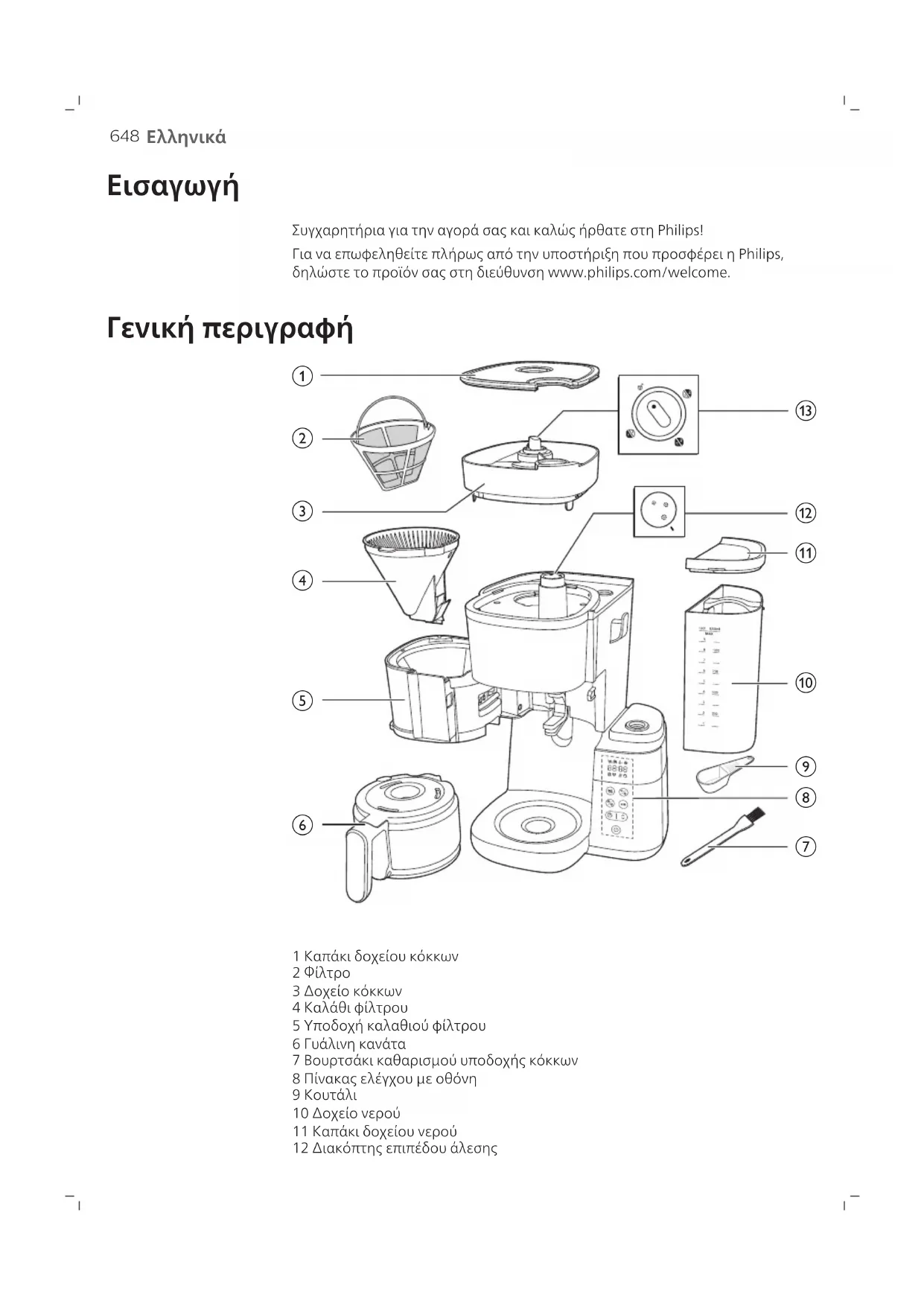 1 Καπάκι δοχείου κόκκων 2 Φίλτρο 3 Δοχείο κόκκων 4 Καλάθι φίλτρου 5 Υποδοχή καλαθιού φίλτρου 6 Γυάλινη κανάτα 7 Βουρτσάκι καθαρισμού υποδοχής κόκκων 8 Πίνακας ελέγχου με οθόνη 9 Κουτάλι 10 Δοχείο νερού 11 Καπάκι δοχείου νερού 12 Διακόπτης επιπέδου άλεσης649
