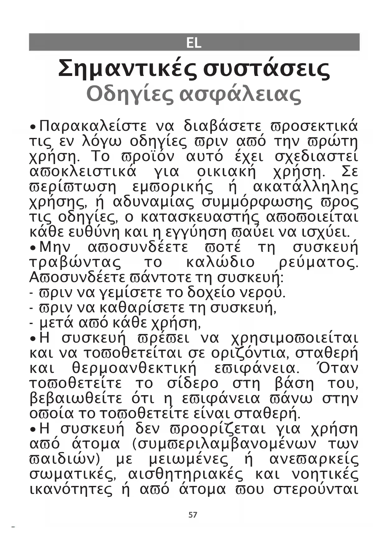 - Η συσκευή δεν προορίζεται για χρήση από άτομα (συμπεριλαμβανομένων των παιδιών) με μειωμένες ή ανεπαρκείς σωματικές, αισθητηριακές και νοητικές ικανότητες ή από άτομα που στερούνται58 της κατάλληλης γνώσης ή εμπειρίας, εκτός εάν βρίσκονται υπό την επίβλεψη ατόμου υπεύθυνου για την ασφάλειά τους ή εάν προηγουμένως λάβουν κατάλληλες οδηγίες σχετικά με τη χρήση της συσκευής.
