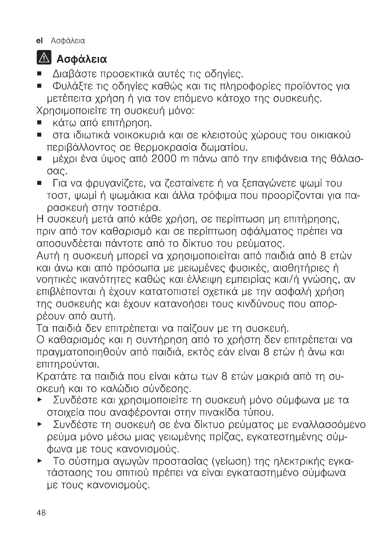 ¡ Για να φρυγανίζετε, να ζεσταίνετε ή να ξεπαγώνετε ψωμί του τοστ, ψωμί ή ψωμάκια και άλλα τρόφιμα που προορίζονται για πα- ρασκευή στην τοστιέρα. Η συσκευή μετά από κάθε χρήση, σε περίπτωση μη επιτήρησης, πριν από τον καθαρισμό και σε περίπτωση σφάλματος πρέπει να αποσυνδέεται πάντοτε από το δίκτυο του ρεύματος. Αυτή η συσκευή μπορεί να χρησιμοποιείται από παιδιά από 8 ετών και άνω και από πρόσωπα με μειωμένες φυσικές, αισθητήριες ή νοητικές ικανότητες καθώς και έλλειψη εμπειρίας και/ή γνώσης, αν επιβλέπονται ή έχουν κατατοπιστεί σχετικά με την ασφαλή χρήση της συσκευής και έχουν κατανοήσει τους κινδύνους που απορ- ρέουν από αυτή. Τα παιδιά δεν επιτρέπεται να παίζουν με τη συσκευή. Ο καθαρισμός και η συντήρηση από το χρήστη δεν επιτρέπεται να πραγματοποιηθούν από παιδιά, εκτός εάν είναι 8 ετών ή άνω και επιτηρούνται. Κρατάτε τα παιδιά που είναι κάτω των 8 ετών μακριά από τη συ- σκευή και το καλώδιο σύνδεσης. ▶ Συνδέστε και χρησιμοποιείτε τη συσκευή μόνο σύμφωνα με τα στοιχεία που αναφέρονται στην πινακίδα τύπου. ▶ Συνδέστε τη συσκευή σε ένα δίκτυο ρεύματος με εναλλασσόμενο ρεύμα μόνο μέσω μιας γειωμένης πρίζας, εγκατεστημένης σύμ- φωνα με τους κανονισμούς. ▶ Το σύστημα αγωγών προστασίας (γείωση) της ηλεκτρικής εγκα- τάστασης του σπιτιού πρέπει να είναι εγκαταστημένο σύμφωνα με τους κανονισμούς.Ασφάλεια el