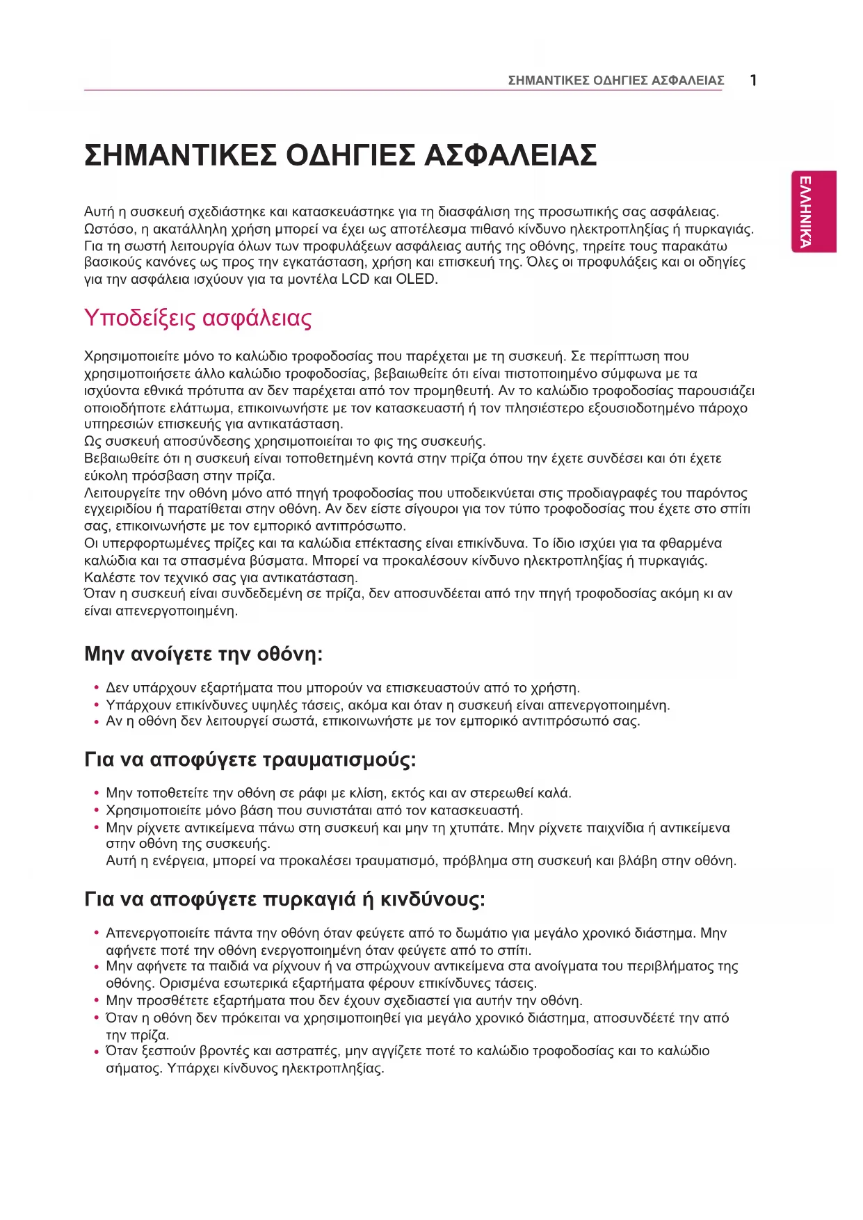 Αυτή η συσκευή σχεδιάστηκε και κατασκευάστηκε για τη διασφάλιση της προσωπικής σας ασφάλειας. Ωστόσο, η ακατάλληλη χρήση μπορεί να έχει ως αποτέλεσμα πιθανό κίνδυνο ηλεκτροπληξίας ή πυρκαγιάς.Για τη σωστή λειτουργία όλων των προφυλάξεων ασφάλειας αυτής της οθόνης, τηρείτε τους παρακάτω βασικούς κανόνες ως προς την εγκατάσταση, χρήση και επισκευή της. Όλες οι προφυλάξεις και οι οδηγίες για την ασφάλεια ισχύουν για τα μοντέλα LCD και OLED. Υποδείξεις ασφάλειας Χρησιμοποιείτε μόνο το καλώδιο τροφοδοσίας που παρέχεται με τη συσκευή. Σε περίπτωση που χρησιμοποιήσετε άλλο καλώδιο τροφοδοσίας, βεβαιωθείτε ότι είναι πιστοποιημένο σύμφωνα με τα ισχύοντα εθνικά πρότυπα αν δεν παρέχεται από τον προμηθευτή. Αν το καλώδιο τροφοδοσίας παρουσιάζει οποιοδήποτε ελάττωμα, επικοινωνήστε με τον κατασκευαστή ή τον πλησιέστερο εξουσιοδοτημένο πάροχο υπηρεσιών επισκευής για αντικατάσταση. Ως συσκευή αποσύνδεσης χρησιμοποιείται το φις της συσκευής. Βεβαιωθείτε ότι η συσκευή είναι τοποθετημένη κοντά στην πρίζα όπου την έχετε συνδέσει και ότι έχετε εύκολη πρόσβαση στην πρίζα.Λειτουργείτε την οθόνη μόνο από πηγή τροφοδοσίας που υποδεικνύεται στις προδιαγραφές του παρόντος εγχειριδίου ή παρατίθεται στην οθόνη. Αν δεν είστε σίγουροι για τον τύπο τροφοδοσίας που έχετε στο σπίτι σας, επικοινωνήστε με τον εμπορικό αντιπρόσωπο.Οι υπερφορτωμένες πρίζες και τα καλώδια επέκτασης είναι επικίνδυνα. Το ίδιο ισχύει για τα φθαρμένα καλώδια και τα σπασμένα βύσματα. Μπορεί να προκαλέσουν κίνδυνο ηλεκτροπληξίας ή πυρκαγιάς. Καλέστε τον τεχνικό σας για αντικατάσταση.Όταν η συσκευή είναι συνδεδεμένη σε πρίζα, δεν αποσυνδέεται από την πηγή τροφοδοσίας ακόμη κι αν είναι απενεργοποιημένη.