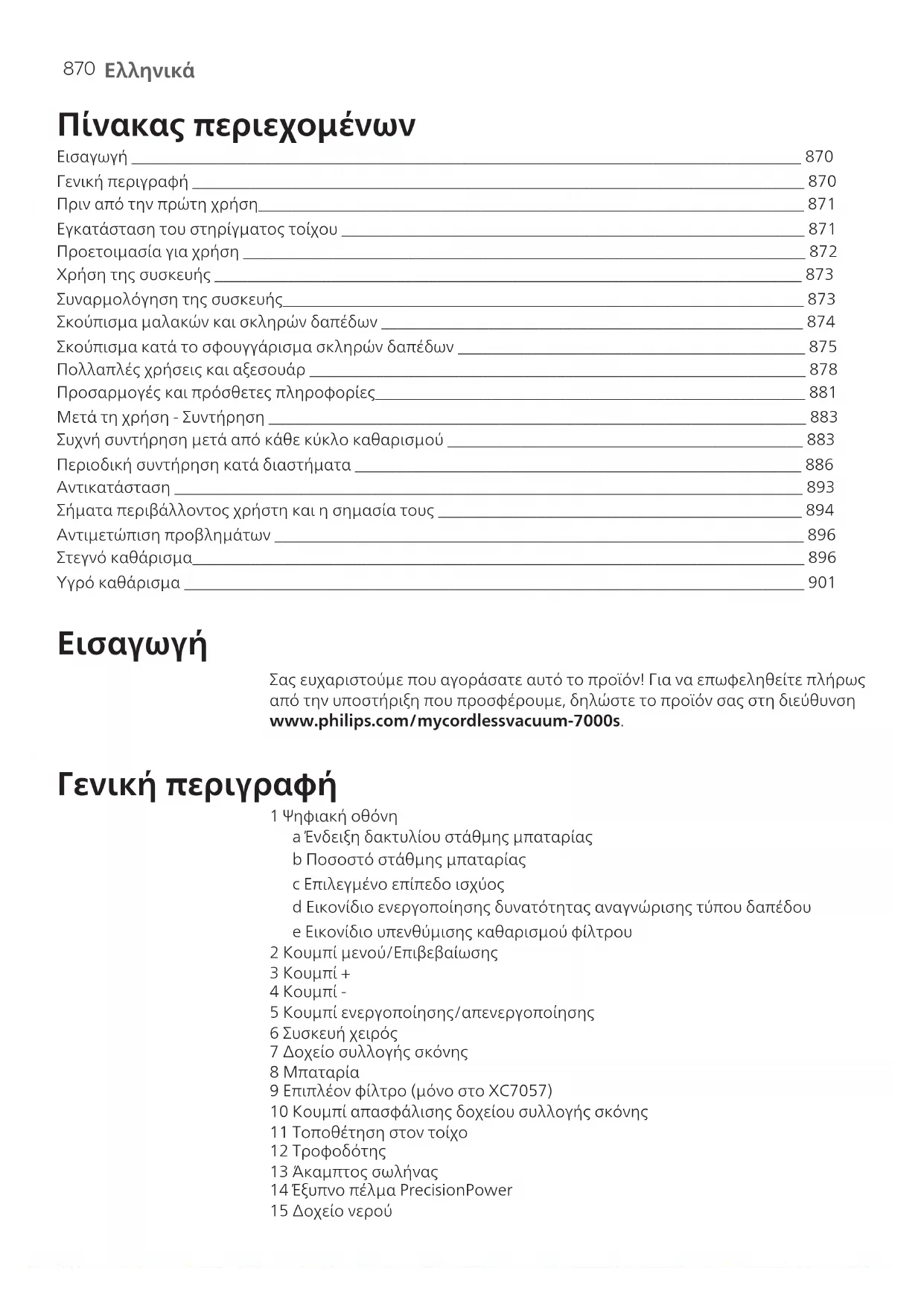 Πίνακας περιεχομένων Εισαγωγή _________________________________________________________________________________ 870 Γενική περιγραφή __________________________________________________________________________ 870 Πριν από την πρώτη χρήση__________________________________________________________________ 871 Εγκατάσταση του στηρίγματος τοίχου ________________________________________________________ 871 Προετοιμασία για χρήση ____________________________________________________________________ 872 Χρήση της συσκευής _______________________________________________________________________ 873 Συναρμολόγηση της συσκευής_______________________________________________________________ 873 Σκούπισμα μαλακών και σκληρών δαπέδων ___________________________________________________ 874 Σκούπισμα κατά το σφουγγάρισμα σκληρών δαπέδων __________________________________________ 875 Πολλαπλές χρήσεις και αξεσουάρ ____________________________________________________________ 878 Προσαρμογές και πρόσθετες πληροφορίες____________________________________________________ 881 Μετά τη χρήση - Συντήρηση _________________________________________________________________ 883 Συχνή συντήρηση μετά από κάθε κύκλο καθαρισμού ___________________________________________ 883 Περιοδική συντήρηση κατά διαστήματα ______________________________________________________ 886 Αντικατάσταση ____________________________________________________________________________ 893 Σήματα περιβάλλοντος χρήστη και η σημασία τους ____________________________________________ 894 Αντιμετώπιση προβλημάτων ________________________________________________________________ 896 Στεγνό καθάρισμα__________________________________________________________________________ 896 Υγρό καθάρισμα ___________________________________________________________________________ 901