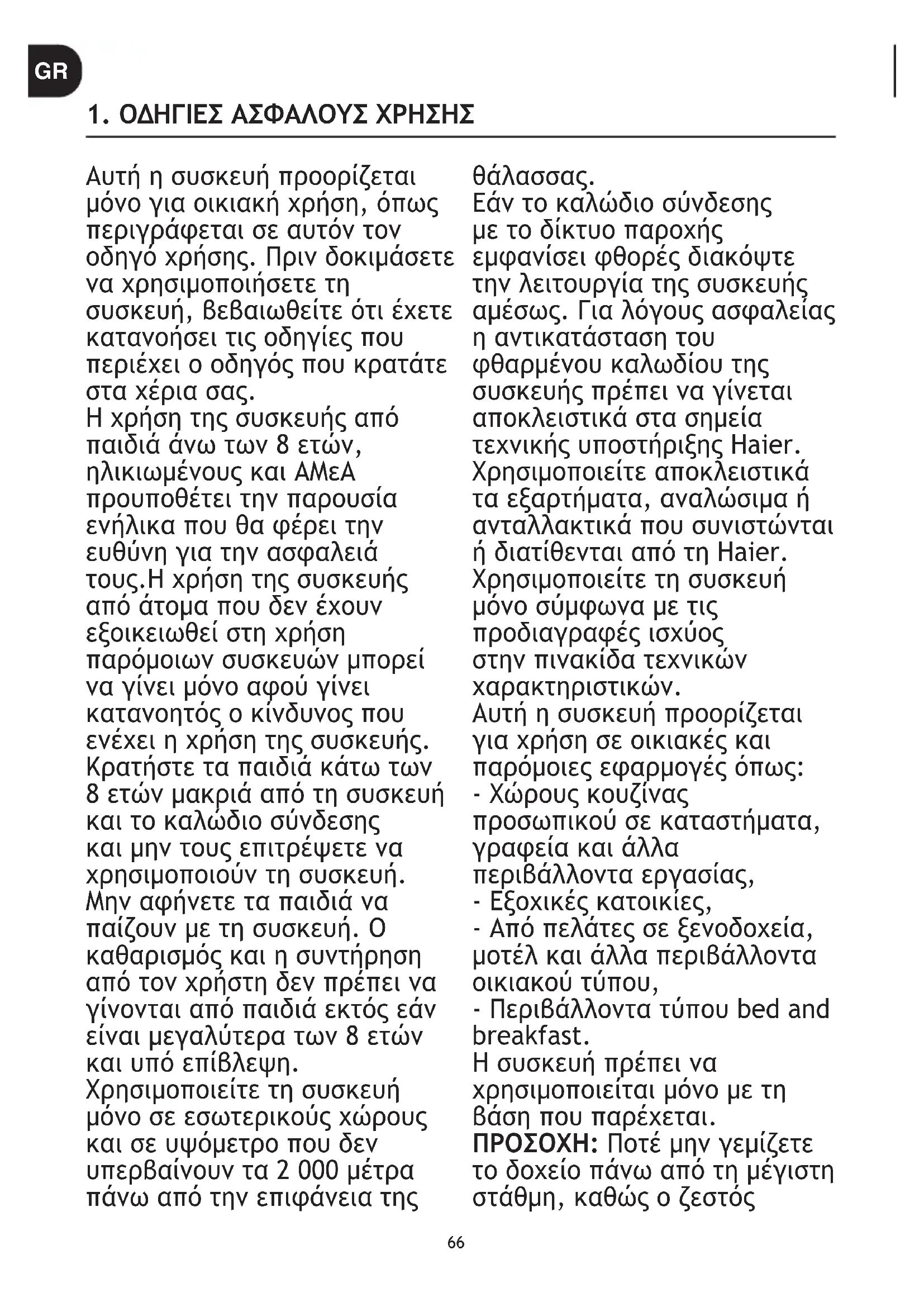 Εάν το καλώδιο σύνδεσης με το δίκτυο παροχής εμφανίσει φθορές διακόψτε την λειτουργία της συσκευής αμέσως. Για λόγους ασφαλείας η αντικατάσταση του φθαρμένου καλωδίου της συσκευής πρέπει να γίνεται αποκλειστικά στα σημεία τεχνικής υποστήριξης Haier. Χρησιμοποιείτε αποκλειστικά τα εξαρτήματα, αναλώσιμα ή ανταλλακτικά που συνιστώνται ή διατίθενται από τη Haier. Χρησιμοποιείτε τη συσκευή μόνο σύμφωνα με τις προδιαγραφές ισχύος στην πινακίδα τεχνικών χαρακτηριστικών. Αυτή η συσκευή προορίζεται για χρήση σε οικιακές και παρόμοιες εφαρμογές όπως: - Χώρους κουζίνας προσωπικού σε καταστήματα, γραφεία και άλλα περιβάλλοντα εργασίας, - Εξοχικές κατοικίες, - Από πελάτες σε ξενοδοχεία, μοτέλ και άλλα περιβάλλοντα οικιακού τύπου, - Περιβάλλοντα τύπου bed and breakfast. Η συσκευή πρέπει να χρησιμοποιείται μόνο με τη βάση που παρέχεται. ΠΡΟΣΟΧΗ: Ποτέ μην γεμίζετε το δοχείο πάνω από τη μέγιστη στάθμη, καθώς ο ζεστός