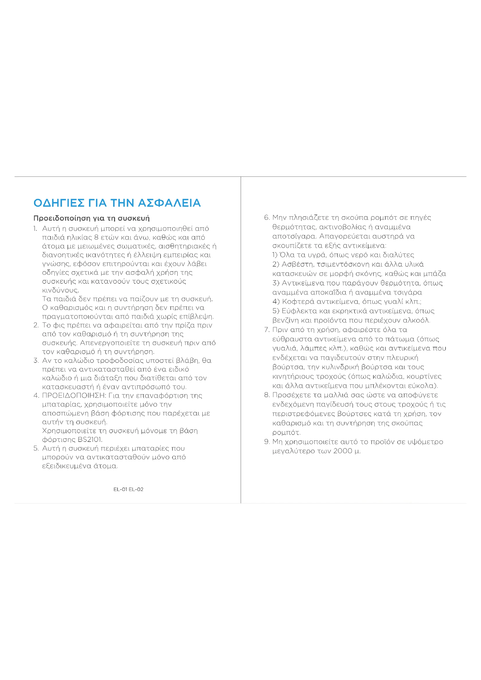 Τα παιδιά δεν πρέπει να παίζουν με τη συσκευή. Ο καθαρισμός και η συντήρηση δεν πρέπει να πραγματοποιούνται από παιδιά χωρίς επίβλεψη. Το φις πρέπει να αφαιρείται από την πρίζα πριν από τον καθαρισμό ή τη συντήρηση της συσκευής. Απενεργοποιείτε τη συσκευή πριν από τον καθαρισμό ή τη συντήρηση. Αν το καλώδιο τροφοδοσίας υποστεί βλάβη, θα πρέπει να αντικατασταθεί από ένα ειδικό καλώδιο ή μια διάταξη που διατίθεται από τον κατασκευαστή ή έναν αντιπρόσωπό του. ΠΡΟΕΙΔΟΠΟΙΗΣΗ: Για την επαναφόρτιση της μπαταρίας, χρησιμοποιείτε μόνο την αποσπώμενη βάση φόρτισης που παρέχεται με αυτήν τη συσκευή. Χρησιμοποιείτε τη συσκευή μόνομε τη βάση φόρτισης BS2101. Αυτή η συσκευή περιέχει μπαταρίες που μπορούν να αντικατασταθούν μόνο από εξειδικευμένα άτομα.