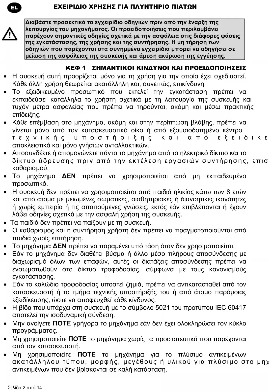 Η συσκευή δεν πρέπει να χρησιμοποιείται από παιδιά ηλικίας κάτω των 8 ετών και από άτομα με μειωμένες σωματικές, αισθητηριακές ή διανοητικές ικανότητες ή χωρίς εμπειρία ή τις απαιτούμενες γνώσεις, εκτός εάν επιβλέπονται ή έχουν λάβει οδηγίες σχετικά με την ασφαλή χρήση της συσκευής. Τα παιδιά δεν πρέπει να παίζουν με τη συσκευή. Ο καθαρισμός και η συντήρηση χρήστη δεν πρέπει να πραγματοποιούνται από παιδιά χωρίς επιτήρηση. Το μηχάνημα ΔΕΝ πρέπει να παραμένει υπό τάση όταν δεν χρησιμοποιείται. Εάν το μηχάνημα δεν διαθέτει βύσμα ή άλλο μέσο πλήρους αποσύνδεσης με διαχωρισμό όλων των επαφών, αυτές οι διατάξεις αποσύνδεσης πρέπει να ενσωματωθούν στο δίκτυο τροφοδοσίας, σύμφωνα με τους κανονισμούς εγκατάστασης. Εάν το καλώδιο τροφοδοσίας υποστεί ζημιά, πρέπει να αντικατασταθεί από τον κατασκευαστή ή το τμήμα τεχνικής υποστήριξής του ή από άτομο παρόμοιας εξειδίκευσης, ώστε να αποφευχθεί κάθε κίνδυνος. Η βίδα που υπάρχει στη συσκευή με το σύμβολο 5021 του προτύπου IEC 60417 αποτελεί την ισοδυναμική σύνδεση. Μην ανοίγετε ΠΟΤΕ γρήγορα το μηχάνημα εάν δεν έχει ολοκληρώσει τον κύκλο προγράμματος. Μη χρησιμοποιείτε ΠΟΤΕ το μηχάνημα χωρίς τα προστατευτικά που παρέχονται από τον κατασκευαστή. Μη χρησιμοποιείτε ΠΟΤΕ το μηχάνημα για το πλύσιμο αντικειμένων ακατάλληλου τύπου, μορφής, μεγέθους ή υλικού για πλύσιμο στο μηχάνημα ή αντικειμένων που δεν βρίσκονται σε καλή κατάσταση.ΕΧΕΙΡΙΔΙΟ ΧΡΗΣΗΣ ΓΙΑ ΠΛΥΝΤΗΡΙΟ ΠΙΑΤΩΝ Σελίδα 3 από 14