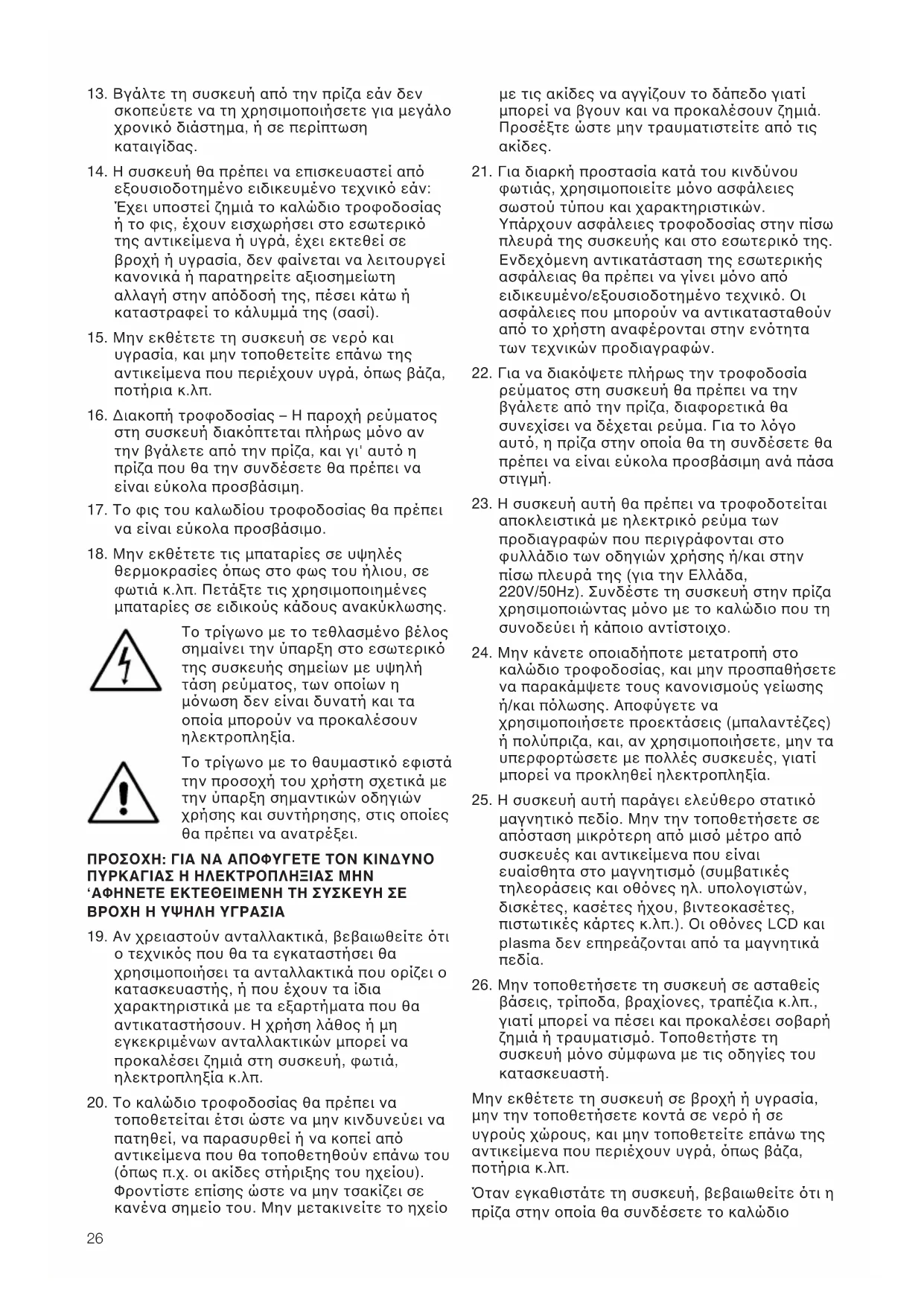 θερµοκρασίες &πως στο φως του ήλιου, σε φωτιά κ.λπ. Πετάξτε τις χρησιµοποιηµένες µπαταρίες σε ειδικούς κάδους ανακύκλωσης. Το τρίγωνο µε το τεθλασµένο βέλος σηµαίνει την ύπαρξη στο εσωτερικ& της συσκευής σηµείων µε υψηλή τάση ρεύµατος, των οποίων η µ&νωση δεν είναι δυνατή και τα οποία µπορούν να προκαλέσουν ηλεκτροπληξία. Το τρίγωνο µε το θαυµαστικ& εφιστά την προσοχή του χρήστη σχετικά µε την ύπαρξη σηµαντικών οδηγιών χρήσης και συντήρησης, στις οποίες θα πρέπει να ανατρέξει. ΠΡΟΣΟΧΗ: ΓΙΑ ΝΑ ΑΠΟΦΥΓΕΤΕ ΤΟΝ ΚΙΝ∆ΥΝΟ ΠΥΡΚΑΓΙΑΣ Η ΗΛΕΚΤΡΟΠΛΗΞΙΑΣ ΜΗΝ ‘ΑΦΗΝΕΤΕ ΕΚΤΕΘΕΙΜΕΝΗ ΤΗ ΣΥΣΚΕΥΗ ΣΕ ΒΡΟΧΗ Η ΥΨΗΛΗ ΥΓΡΑΣΙΑ