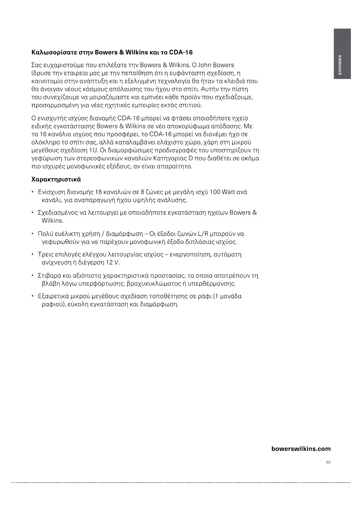 bowerswilkins.com Καλωσορίσατε στην Bowers & Wilkins και το CDA-16 Σας ευχαριστούμε που επιλέξατε την Bowers & Wilkins. Ο John Bowers ίδρυσε την εταιρεία μας με την πεποίθηση ότι η ευφάνταστη σχεδίαση, η καινοτομία στην ανάπτυξη και η εξελιγμένη τεχνολογία θα ήταν τα κλειδιά που θα άνοιγαν νέους κόσμους απόλαυσης του ήχου στο σπίτι. Αυτήν την πίστη του συνεχίζουμε να μοιραζόμαστε και εμπνέει κάθε προϊόν που σχεδιάζουμε, προσαρμοσμένη για νέες ηχητικές εμπειρίες εκτός σπιτιού. Ο ενισχυτής ισχύος διανομής CDA-16 μπορεί να φτάσει οποιοδήποτε ηχείο ειδικής εγκατάστασης Bowers & Wilkins σε νέο αποκορύφωμα απόδοσης. Με τα 16 κανάλια ισχύος που προσφέρει, το CDA-16 μπορεί να διανέμει ήχο σε ολόκληρο το σπίτι σας, αλλά καταλαμβάνει ελάχιστο χώρο, χάρη στη μικρού μεγέθους σχεδίαση 1U. Οι διαμορφώσιμες προδιαγραφές του υποστηρίζουν τη γεφύρωση των στερεοφωνικών καναλιών Κατηγορίας D που διαθέτει σε ακόμα πιο ισχυρές μονοφωνικές εξόδους, αν είναι απαραίτητο. Χαρακτηριστικά