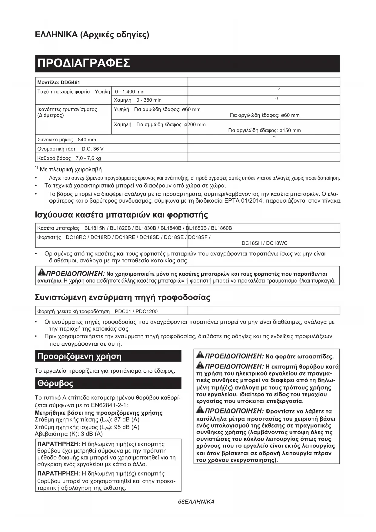 ):95dB(A) Αβεβαιότητα(Κ):3dB(A) ΠΑΡΑΤΗΡΗΣΗ:Ηδηλωμένητιμή(ές)εκπομπής θορύβουέχειμετρηθείσύμφωναμετηνπρότυπη μέθοδοδοκιμήςκαιμπορείναχρησιμοποιηθείγιατη σύγκρισηενόςεργαλείουμεκάποιοάλλο. ΠΑΡΑΤΗΡΗΣΗ:Ηδηλωμένητιμή(ές)εκπομπής θορύβουμπορείναχρησιμοποιηθείκαιστηνπροκα- ταρκτικήαξιολόγησητηςέκθεσης. ΠΡΟΕΙΔΟΠΟΙΗΣΗ: Να φοράτε ωτοασπίδες. ΠΡΟΕΙΔΟΠΟΙΗΣΗ: Η εκπομπή θορύβου κατά τη χρήση του ηλεκτρικού εργαλείου σε πραγμα- τικές συνθήκες μπορεί να διαφέρει από τη δηλω- μένη τιμή(ές) ανάλογα με τους τρόπους χρήσης του εργαλείου, ιδιαίτερα το είδος του τεμαχίου εργασίας που υπόκειται επεξεργασία. ΠΡΟΕΙΔΟΠΟΙΗΣΗ: Φροντίστε να λάβετε τα κατάλληλα μέτρα προστασίας του χειριστή βάσει ενός υπολογισμού της έκθεσης σε πραγματικές συνθήκες χρήσης (λαμβάνοντας υπόψη όλες τις συνιστώσες του κύκλου λειτουργίας όπως τους χρόνους που το εργαλείο είναι εκτός λειτουργίας και όταν βρίσκεται σε αδρανή λειτουργία πέραν του χρόνου ενεργοποίησης).69 ΕΛΛΗΝΙΚΑ
