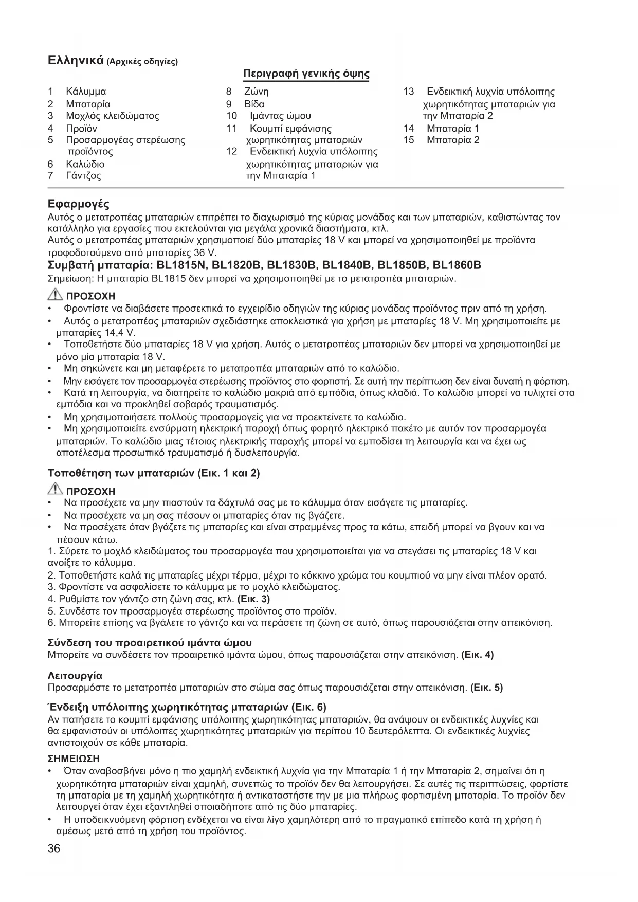 6 Καλώδιο 7 Γάντζος 8 Ζώνη 9 Βίδα 10 Ιμάνταςώμου 11 Κουμπίεμφάνισης χωρητικότηταςμπαταριών 12 Ενδεικτικήλυχνίαυπόλοιπης χωρητικότηταςμπαταριώνγια τηνΜπαταρία1 13 Ενδεικτικήλυχνίαυπόλοιπης χωρητικότηταςμπαταριώνγια τηνΜπαταρία2 14 Μπαταρία1 15 Μπαταρία2 Ελληνικά (Αρχικές οδηγίες) Περιγραφή γενικής όψης