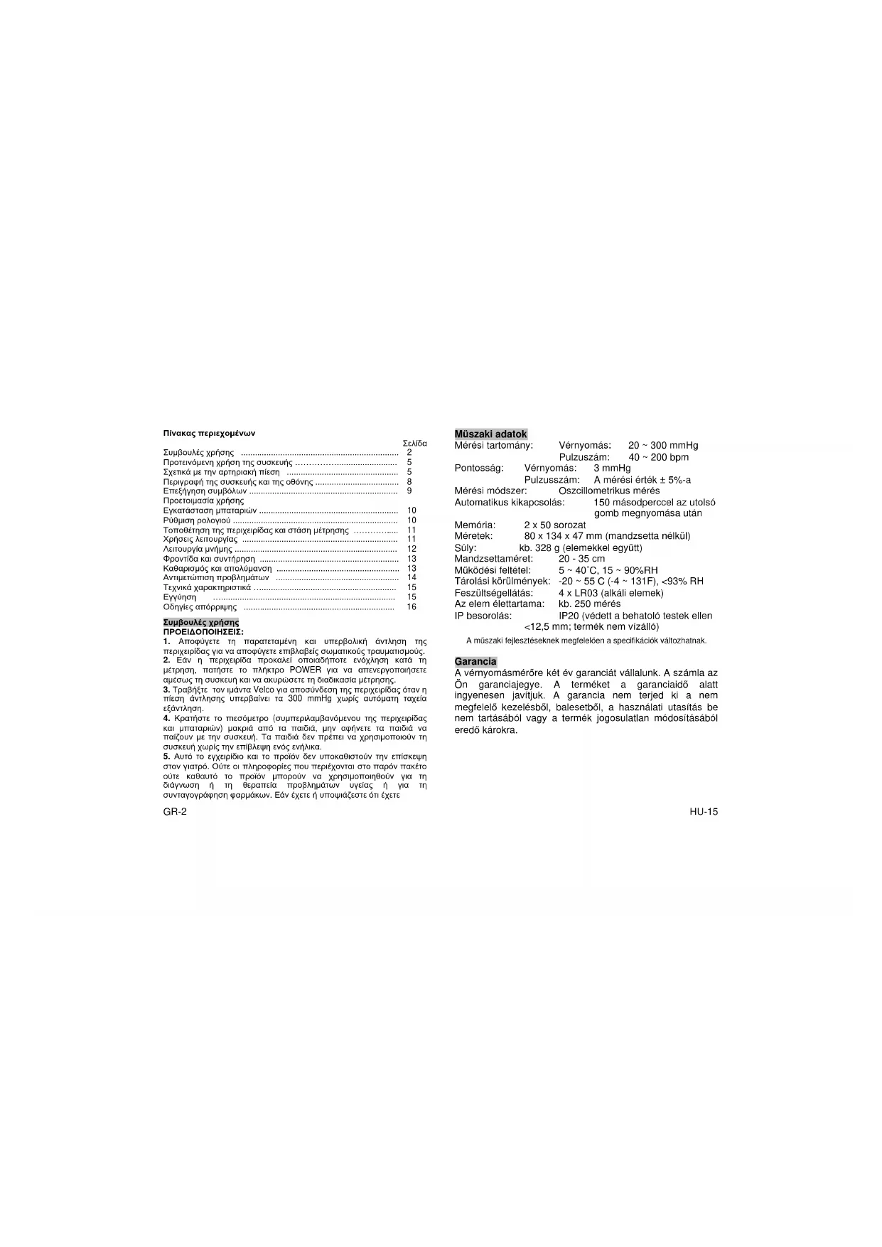 elemekkel együtt) tartsa távol gyermekektől a helytelen HU-2 Τεχνικά χαρακτηριστικά Εύρος μέτρησης: Πίεση: 20 ~ 300 mmHg Συχνότητα παλμών: 40 ~ 200 bpm Ακρίβεια: Πίεση: 3 mmHg Παλμοί: ± 5% της τιμής μέτρησης Μέθοδος μέτρησης: Παλμοσκοπική Αυτόματη απενεργοποίηση: 150 δευτερόλεπτα μετά από αδράνεια Μνήμη: 2 x 50 θέσεις μνήμης Διαστάσεις: 80 x 134 x 47 mm (χωρίς την περιχειρίδα) Βάρος: περίπου 328 g (συμπεριλαμβανόμενου τις