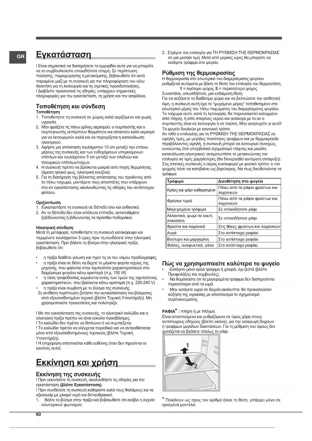 Εγκατάσταση ! Είναι σημαντικό να διατηρήσετε το εγχειρίδιο αυτό για να μπορείτε να το συμβουλεύεστε οποιαδήποτε στιγμή. Σε περίπτωση πώλησης, παραχώρησης ή μετακόμισης, βεβαιωθείτε ότι αυτό παραμένει μαζί με τη συσκευή για την πληροφόρηση του νέου ιδιοκτήτη για τη λειτουργία και τις σχετικές προειδοποιήσεις.! Διαβάστε προσεκτικά τις οδηγίες: υπάρχουν σημαντικές πληροφορίες για την εγκατάσταση, τη χρήση και την ασφάλεια. Τοποθέτηση και σύνδεση Τοποθέτηση1. Τοποθετήστε τη συσκευή σε χώρος καλά αεριζόμενο και χωρίς υγρασία.2. Μην φράζετε τις πίσω γρίλιες αερισμού: ο συμπιεστής και ο συμπυκνωτής εκπέμπουν θερμότητα και απαιτούν καλό αερισμό για να λειτουργούν καλά και να περιορίζεται η κατανάλωση ηλεκτρικού.3. Αφήστε μια απόσταση τουλάχιστον 10 cm μεταξύ του επάνω μέρους της συσκευής και των ενδεχόμενων υπερκείμενων επίπλων και τουλάχιστον 5 cm μεταξύ των πλαϊνών και πλευρικώνεπίπλων/τοίχων.4. Η συσκευή πρέπει να βρίσκεται μακριά από πηγές θερμότητας (άμεσο ηλιακό φως, ηλεκτρική κουζίνα).5. Για τη διατήρηση της βέλτιστης απόστασης του προϊόντος από το πίσω τοίχωμα, μοντάρετε τους αποστάτες που υπάρχουν στο κιτ εγκατάστασης ακολουθώντας τις οδηγίες του αντίστοιχου φύλλου.Οριζοντίωση1. Εγκαταστήστε τη συσκευή σε δάπεδο ίσιο και ανθεκτικό.2. Αν το δάπεδο δεν είναι απόλυτα επίπεδο, αντισταθμίστε ξεβιδώνοντας ή βιδώνοντας τα πρόσθια ποδαράκια.Ηλεκτρική σύνδεσηΜετά τη μεταφορά, τοποθετήστε τη συσκευή κατακόρυφα και περιμένετε τουλάχιστον 3 ώρες πριν τη συνδέσετε στην ηλεκτρική εγκατάσταση. Πριν βάλετε το βύσμα στην ηλεκτρική πρίζα, βεβαιωθείτε ότι:• ηπρίζαδιαθέτειγείωσηκαιτηρείτιςεκτουνόμουπροδιαγραφές• ηπρίζαείναισεθέσηναδεχτείτομέγιστοφορτίοισχύοςτηςμηχανής, που φαίνεται στην ταμπελίτσα χαρακτηριστικών στο διαμέρισμα ψυγείου κάτω αριστερά (π.χ. 150 W)• ητάσητροφοδοσίαςκυμαίνεταιεντόςτωντιμώντηςταμπελίτσαςχαρακτηριστικών, που βρίσκεται κάτω αριστερά (π.χ. 220-240 V)• ηπρίζαείναισυμβατήμετοβύσματηςσυσκευής. Σε αντίθετη περίπτωση ζητήστε την αντικατάσταση του βύσματος από εξουσιοδοτημένο τεχνικό (βλέπε Τεχνική Υποστήριξη). Μη χρησιμοποιείτε προεκτάσεις και πολύπριζα.! Με την εγκατάσταση της συσκευής, το ηλεκτρικό καλώδιο και η ηλεκτρική πρίζα πρέπει να είναι εύκολα προσβάσιμες.! Το καλώδιο δεν πρέπει να διπλώνει ή να συμπιέζεται.! Το καλώδιο πρέπει να ελέγχεται περιοδικά και να αντικαθίσταται μόνο από εξουσιοδοτημένους τεχνικούς (βλέπε Τεχνική Υποστήριξη).! Η επιχείρηση αποποιείται κάθε ευθύνης όταν δεν τηρούνται οι κανόνες αυτοί. Εκκίνηση και χρήση Εκκίνηση της συσκευής ! Πριν εκκινήσετε τη συσκευή, ακολουθήστε τις οδηγίες για την εγκατάσταση (βλέπε Εγκατάσταση).! Πριν συνδέσετε τη συσκευή καθαρίστε καλά τους θαλάμους και τα αξεσουάρ με χλιαρό νερό και διττανθρακικό.1. Βάλτετοβύσμαστηνπρίζακαιβεβαιωθείτεότιανάβειηλυχνίαεσωτερικού φωτισμού.2. Στρέψτε τον επιλογέα για ΤΗ ΡΥΘΜΙΣΗ ΤΗΣ ΘΕΡΜΟΚΡΑΣΙΑΣ σε μια μεσαία τιμή. Μετά από μερικές ώρες θα μπορείτε να εισάγετε τρόφιμα στο ψυγείο. Ρύθμιση της θερμοκρασίας Η θερμοκρασία στο εσωτερικό του διαμερίσματος ψυγείου ρυθμίζεται αυτόματα με βάση τη θέση του επιλογέα του θερμοστάτη. 1 = λιγότερο ψύχος 5 = περισσότερο ψύχος Συνιστάται, οπωσδήποτε, μια ενδιάμεση θέσηΓια να αυξήσετε το διαθέσιμο χώρο και να βελτιώσετε την αισθητική όψη, η συσκευή αυτή έχει το “ψυχόμενο μέρος” τοπ