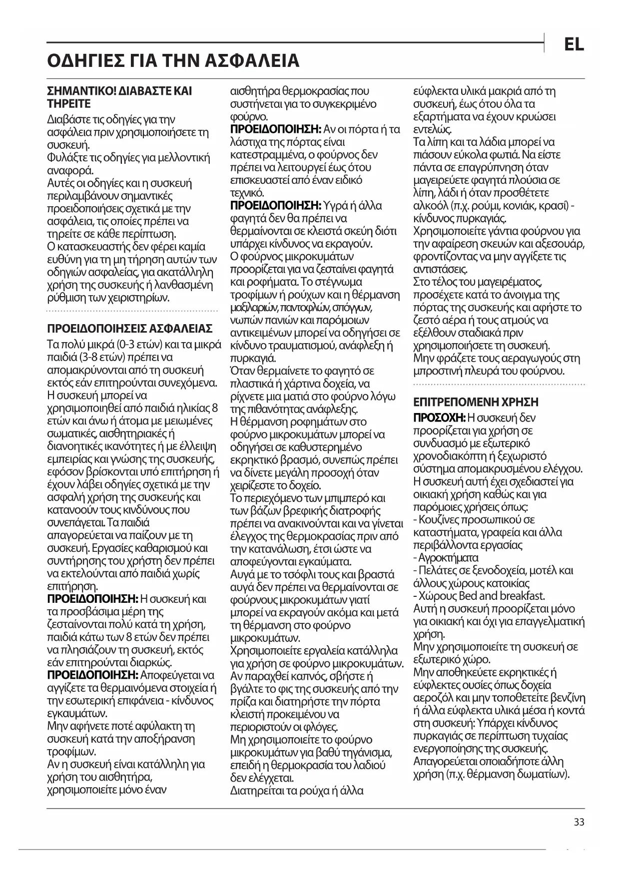 Αυτές οι οδηγίες και η συσκευή περιλαμβάνουν σημαντικές προειδοποιήσεις σχετικά με την ασφάλεια, τις οποίες πρέπει να τηρείτε σε κάθε περίπτωση. Ο κατασκευαστής δεν φέρει καμία ευθύνη για τη μη τήρηση αυτών των οδηγιών ασφαλείας, για ακατάλληλη χρήση της συσκευής ή λανθασμένη ρύθμιση των χειριστηρίων. ΠΡΟΕΙΔΟΠΟΙΗΣΕΙΣ ΑΣΦΑΛΕΙΑΣ Τα πολύ μικρά (0-3 ετών) και τα μικρά παιδιά (3-8 ετών) πρέπει να απομακρύνονται από τη συσκευή εκτός εάν επιτηρούνται συνεχόμενα. Η συσκευή μπορεί να χρησιμοποιηθεί από παιδιά ηλικίας 8 ετών και άνω ή άτομα με μειωμένες σωματικές, αισθητηριακές ή διανοητικές ικανότητες ή με έλλειψη εμπειρίας και γνώσης της συσκευής, εφόσον βρίσκονται υπό επιτήρηση ή έχουν λάβει οδηγίες σχετικά με την ασφαλή χρήση της συσκευής και κατανοούν τους κινδύνους που συνεπάγεται. Τα παιδιά απαγορεύεται να παίζουν με τη συσκευή. Εργασίες καθαρισμού και συντήρησης του χρήστη δεν πρέπει να εκτελούνται από παιδιά χωρίς