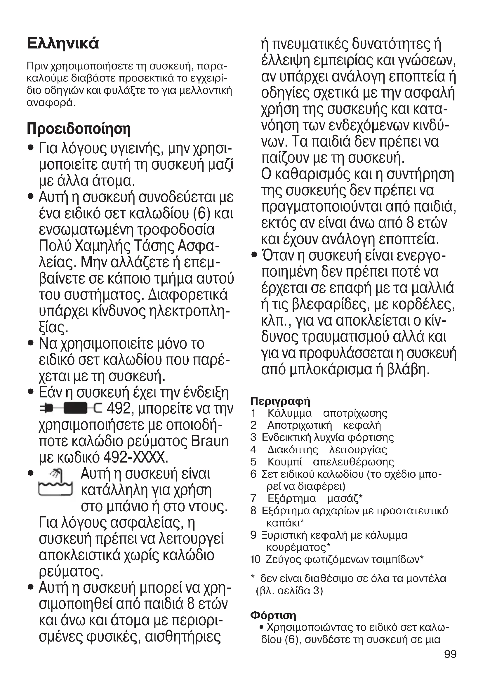 Εάν η συσκευή έχει την ένδειξη 492, μπορείτε να την χρησιμοποιήσετε με οποιοδή- ποτε καλώδιο ρεύματος Braun με κωδικό 492-ΧΧΧΧ.