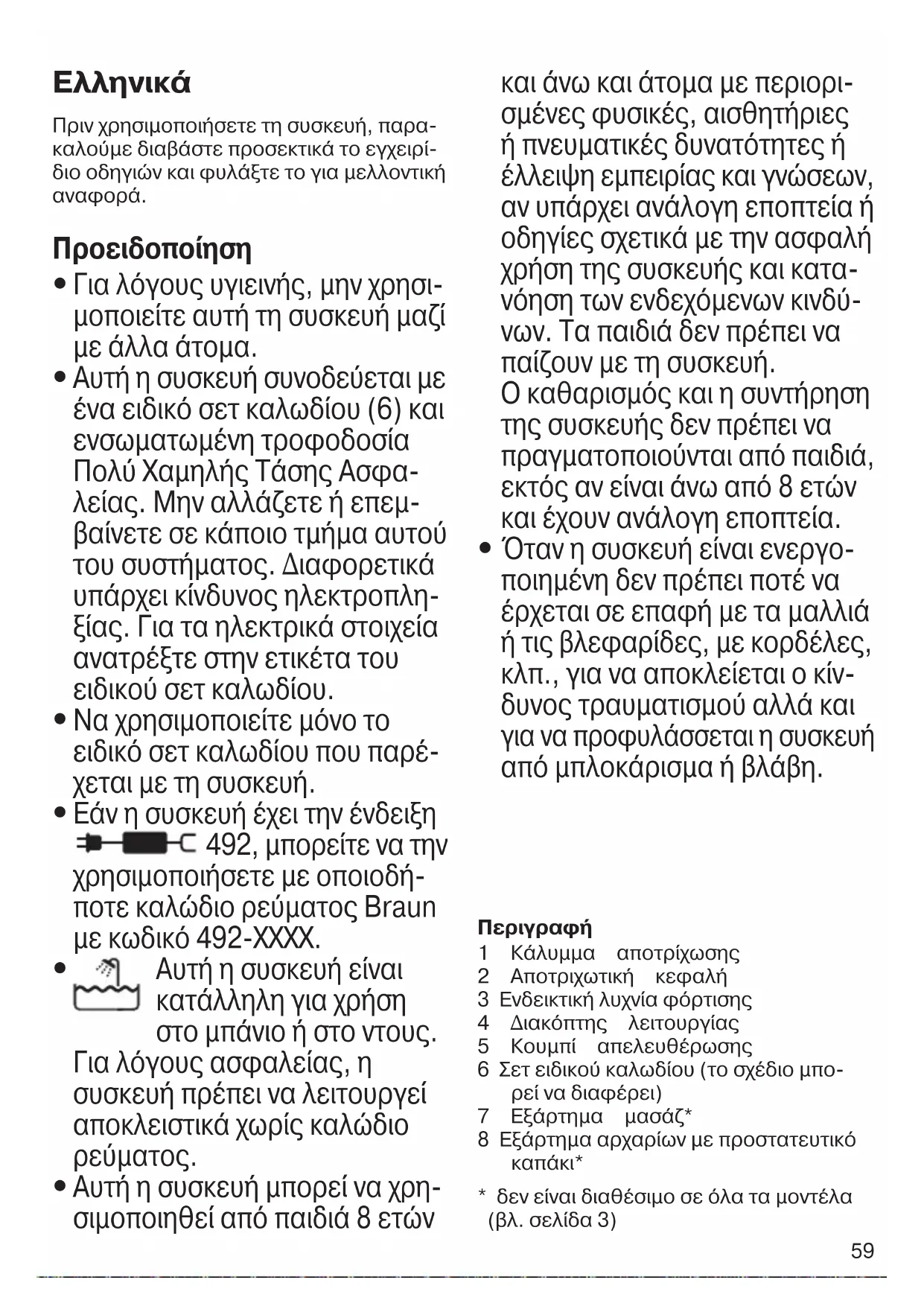 Εάν η συσκευή έχει την ένδειξη 492, μπορείτε να την χρησιμοποιήσετε με οποιοδή- ποτε καλώδιο ρεύματος Braun με κωδικό 492-ΧΧΧΧ.