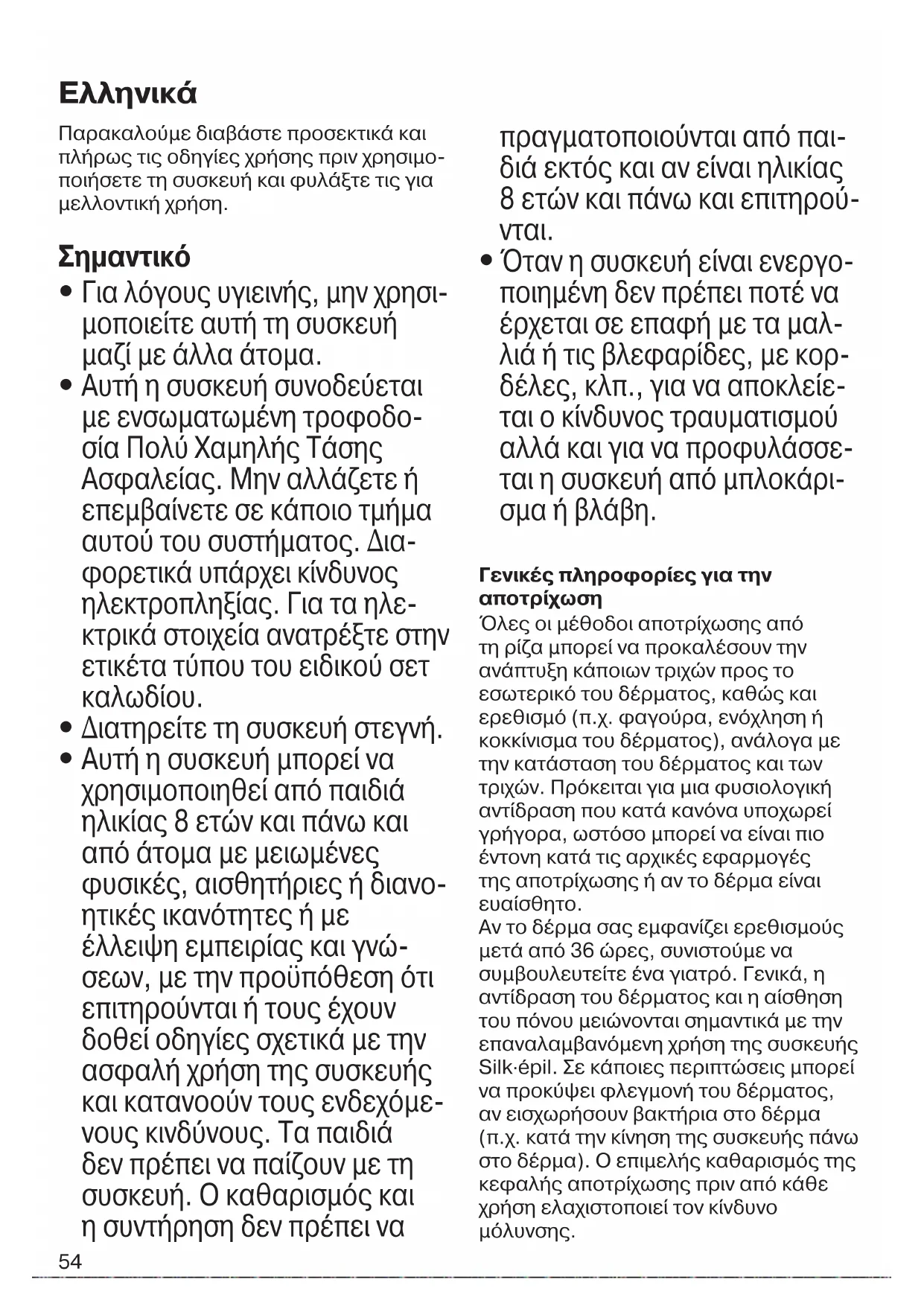 Όταν η συσκευή είναι ενεργο- ποιημένη δεν πρέπει ποτέ να έρχεται σε επαφή με τα μαλ- λιά ή τις βλεφαρίδες, με κορ- δέλες, κλπ., για να αποκλείε- ται ο κίνδυνος τραυματισμού αλλά και για να προφυλάσσε- ται η συσκευή από μπλοκάρι- σμα ή βλάβη. Γενικές πληροφορίες για την