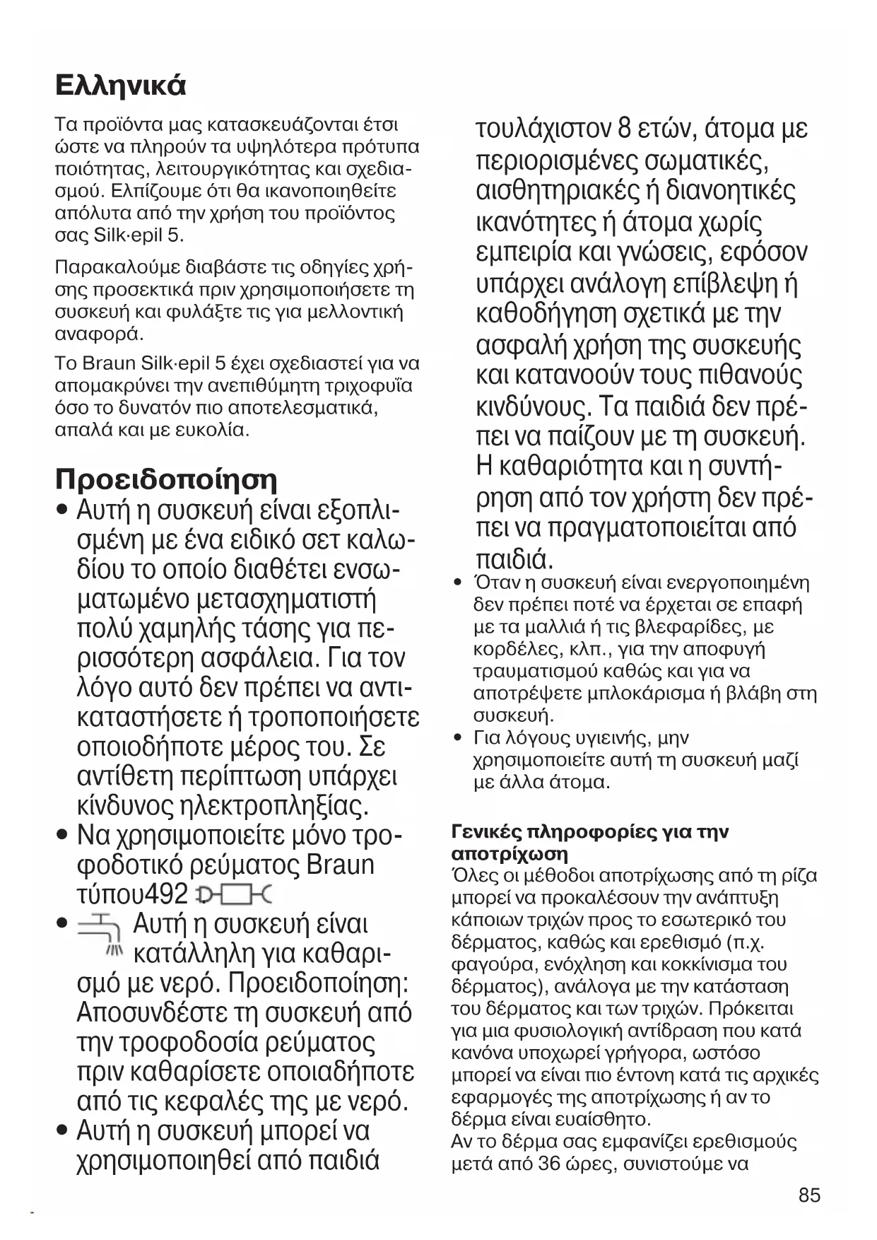 90340813_SE5_Power_MN.indd 8590340813_SE5_Power_MN.indd 85 02.06.22 10:4902.06.22 10:4986 συμβουλευτείτε ένα γιατρό. Γενικά, η αντίδραση του δέρματος και η αίσθηση του πόνου μειώνονται σημαντικά με την επαναλαμβανόμενη χρήση της συσκευής Silk·épil. Σε κάποιες περιπτώσεις μπορεί να προκύψει φλεγμονή του δέρματος, αν εισχωρήσουν βακτήρια στο δέρμα (π.χ. κατά την κίνηση της συσκευής πάνω στο δέρμα). Ο επιμελής καθαρισμός της κεφαλής αποτρίχωσης πριν από κάθε χρήση ελαχιστοποιεί τον κίνδυνο