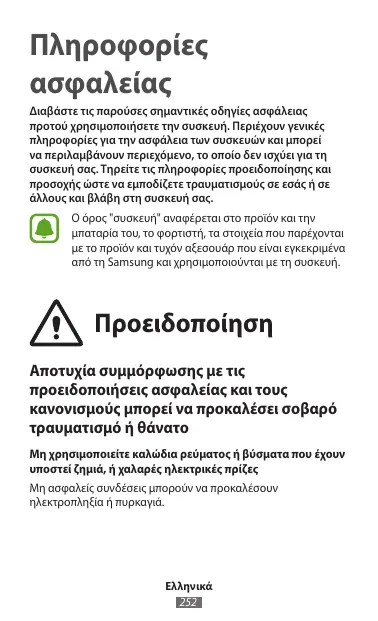 Πληροφορίες ασφαλείας Διαβάστε τις παρούσες σημαντικές οδηγίες ασφάλειας προτού χρησιμοποιήσετε την συσκευή. Περιέχουν γενικές πληροφορίες για την ασφάλεια των συσκευών και μπορεί να περιλαμβάνουν περιεχόμενο, το οποίο δεν ισχύει για τη συσκευή σας. Τηρείτε τις πληροφορίες προειδοποίησης και προσοχής ώστε να εμποδίζετε τραυματισμούς σε εσάς ή σε άλλους και βλάβη στη συσκευή σας. Ο όρος "συσκευή" αναφέρεται στο προϊόν και την μπαταρία του, το φορτιστή, τα στοιχεία που παρέχονται με το προϊόν και τυχόν αξεσουάρ που είναι εγκεκριμένα από τη Samsung και χρησιμοποιούνται με τη συσκευή.