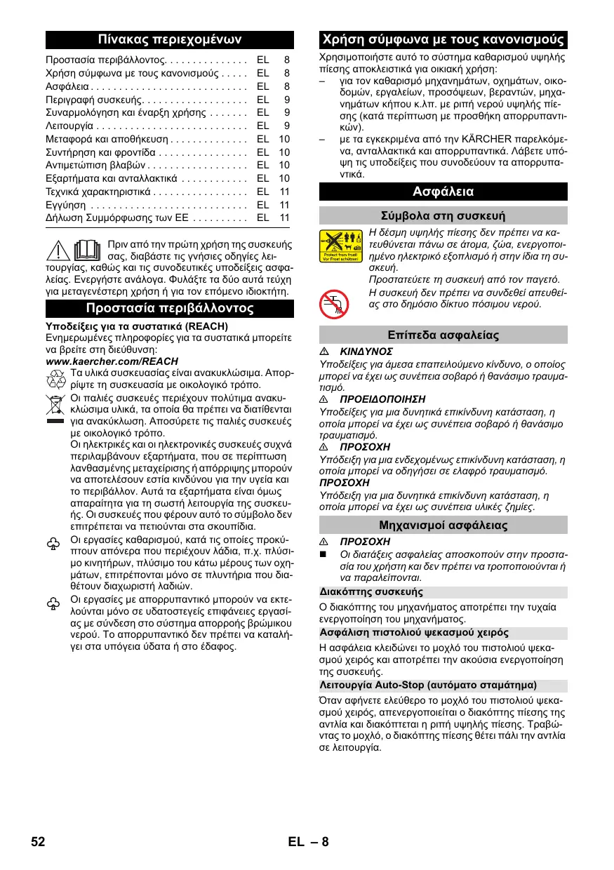 Σύμβολα στη συσκευή Η δέσμη υψηλής πίεσης δεν πρέπει να κατευθύνεται πάνω σε άτομα, ζώα, ενεργοποιημένο ηλεκτρικό εξοπλισμό ή στην ίδια τη συσκευή. Προστατεύετε τη συσκευή από τον παγετό. Η συσκευή δεν πρέπει να συνδεθεί απευθείας στο δημόσιο δίκτυο πόσιμου νερού. Πριν από την πρώτη χρήση της συσκευής σας, διαβάστε τις γνήσιες οδηγίες λειτουργίας, καθώς και τις συνοδευτικές υποδείξεις ασφαλείας. Ενεργήστε ανάλογα. Φυλάξτε τα δύο αυτά τεύχη για μεταγενέστερη χρήση ή για τον επόμενο ιδιοκτήτη. Προστασία περιβάλλοντος Υποδείξεις για τα συστατικά (REACH) Ενημερωμένες πληροφορίες για τα συστατικά μπορείτε να βρείτε στη διεύθυνση: www.kaercher.com/REACH Τα υλικά συσκευασίας είναι ανακυκλώσιμα. Απορρίψτε τη συσκευασία με οικολογικό τρόπο. Οι παλιές συσκευές περιέχουν πολύτιμα ανακυκλώσιμα υλικά, τα οποία θα πρέπει να διατίθενται για ανακύκλωση. Αποσύρετε τις παλιές συσκευές με οικολογικό τρόπο. Οι ηλεκτρικές και οι ηλεκτρονικές συσκευές συχνά περιλαμβάνουν εξαρτήματα, που σε περίπτωση λανθασμένης μεταχείρισης ή απόρριψης μπορούν να αποτελέσουν εστία κινδύνου για την υγεία και το περιβάλλον. Αυτά τα εξαρτήματα είναι όμως απαραίτητα για τη σωστή λειτουργία της συσκευής. Οι συσκευές που φέρουν αυτό το σύμβολο δεν επιτρέπεται να πετιούνται στα σκουπίδια. Οι εργασίες καθαρισμού, κατά τις οποίες προκύπτουν απόνερα που περιέχουν λάδια, π.χ. πλύσιμο κινητήρων, πλύσιμο του κάτω μέρους των οχημάτων, επιτρέπονται μόνο σε πλυντήρια που διαθέτουν διαχωριστή λαδιών. Οι εργασίες με απορρυπαντικό μπορούν να εκτελούνται μόνο σε υδατοστεγείς επιφάνειες εργασίας με σύνδεση στο σύστημα απορροής βρώμικου νερού. Το απορρυπαντικό δεν πρέπει να καταλήγει στα υπόγεια ύδατα ή στο έδαφος. Επίπεδα ασφαλείας Υποδείξεις για άμεσα επαπειλούμενο κίνδυνο, ο οποίος μπορεί να έχει ως συνέπεια σοβαρό ή θανάσιμο τραυματισμό. 몇 ΠΡΟΕΙΔΟΠΟΙΗΣΗ Υποδείξεις για μια δυνητικά επικίνδυνη κατάσταση, η οποία μπορεί να έχει ως συνέπεια σοβαρό ή θανάσιμο τραυματισμό. Υπόδειξη για μια ενδεχομένως επικίνδυνη κατάσταση, η οποία μπορεί να οδηγήσει σε ελαφρό τραυματισμό. Υπόδειξη για μια δυνητικά επικίνδυνη κατάσταση, η οποία μπορεί να έχει ως συνέπεια υλικές ζημίες. Μηχανισμοί ασφάλειας