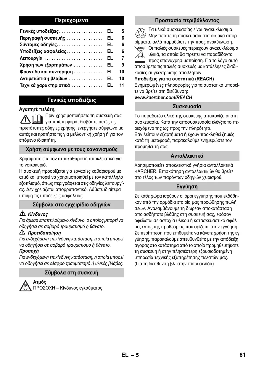 Για άμεσα επαπειλούμενο κίνδυνο, ο οποίος μπορεί να οδηγήσει σε σοβαρό τραυματισμό ή θάνατο. 몇 Προειδοποίηση Για ενδεχόμενη επικίνδυνη κατάσταση, η οποία μπορεί να οδηγήσει σε σοβαρό τραυματισμό ή θάνατο. Για ενδεχόμενη επικίνδυνη κατάσταση, η οποία μπορεί να οδηγήσει σε ελαφρό τραυματισμό ή υλικές βλάβες. Τα υλικά συσκευασίας είναι ανακυκλώσιμα. Μην πετάτε τη συσκευασία στα οικιακά απορ ρίμματα, αλλά παραδώστε την προς ανακύκλωση. Οι παλιές συσκευές περιέχουν ανακυκλώσιμα υλικά, τα οποία θα πρέπει να παραδίδονται προς επαναχρησιμοποίηση. Για το λόγο αυτό αποσύρετε τις παλιές συσκευές με κατάλληλες διαδικασίες συγκέντρωσης αποβλήτων. Υποδείξεις για τα συστατικά (REACH) Ενημερωμένες πληροφορίες για τα συστατικά μπορείτε να βρείτε στη διεύθυνση: www.kaercher.com/REACH