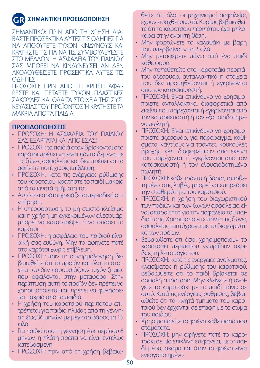 θείτε ότι όλοι οι μηχανισμοί ασφαλείας έχουν εισαχθεί σωστά. Κυρίως βεβαιωθείτε ότι το καροτσάκι περιπάτου έχει μπλοκάρει στην ανοικτή θέση. Μην φορτώνετε το καλαθάκι με βάρη που υπερβαίνουν τα 2 κιλά. Μην μεταφέρετε πάνω από ένα παιδί κάθε φορά. Μην τοποθετείτε στο καροτσάκι περιπάτου αξεσουάρ, ανταλλακτικά ή στοιχεία που δεν προμηθεύονται ή εγκρίνονται από τον κατασκευαστή. ΠΡΟΣΟΧΗ: Είναι επικίνδυνο να χρησιμοποιείτε ανταλλακτικά, διαφορετικά από εκείνα που παρέχονται ή εγκρίνονται από τον κατασκευαστή ή τον εξουσιοδοτημένο πωλητή. ΠΡΟΣΟΧΗ: Είναι επικίνδυνο να χρησιμοποιείτε αξεσουάρ, για παράδειγμα, καθίσματα, γάντζους για τσάντες, κουκούλες βροχής, κλπ. διαφορετικών από εκείνα που παρέχονται ή εγκρίνονται από τον κατασκευαστή ή τον εξουσιοδοτημένο πωλητή. ΠΡΟΣΟΧΗ: κάθε τσάντα ή βάρος τοποθετημένο στις λαβές, μπορεί να επηρεάσει την σταθερότητα του καροτσιού. ΠΡΟΣΟΧΗ: η χρήση του διαχωριστικού των ποδιών και των ζωνών ασφαλείας, είναι απαραίτητη για την ασφάλεια του παιδιού σας. Χρησιμοποιείτε πάντα τις ζώνες ασφαλείας ταυτόχρονα με το διαχωριστικό των ποδιών. Βεβαιωθείτε ότι όσοι χρησιμοποιούν το καροτσάκι περιπάτου γνωρίζουν ακριβώς τη λειτουργία του. ΠΡΟΣΟΧΗ: κατά τις ενέργειες ανοίγματος, κλεισίματος ή ρύθμισης του καροτσιού, βεβαιωθείτε ότι το παιδί βρίσκεται σε ασφαλή απόσταση. Μην κλείνετε ή ανοίγετε το καροτσάκι με το παιδί πάνω σε αυτό. Κατά τις ενέργειες ρύθμισης, βεβαιωθείτε ότι τα κινητά τμήματα του καροτσιού δεν έρχονται σε επαφή με το σώμα του παιδιού. Χρησιμοποιείτε το φρένο κάθε φορά που σταματάτε. ΠΡΟΣΟΧΗ: μην αφήνετε ποτέ το καροτσάκι σε μία επικλινή επιφάνεια, με το παιδί μέσα, ακόμα και όταν το φρένο είναι ενεργοποιημένο.