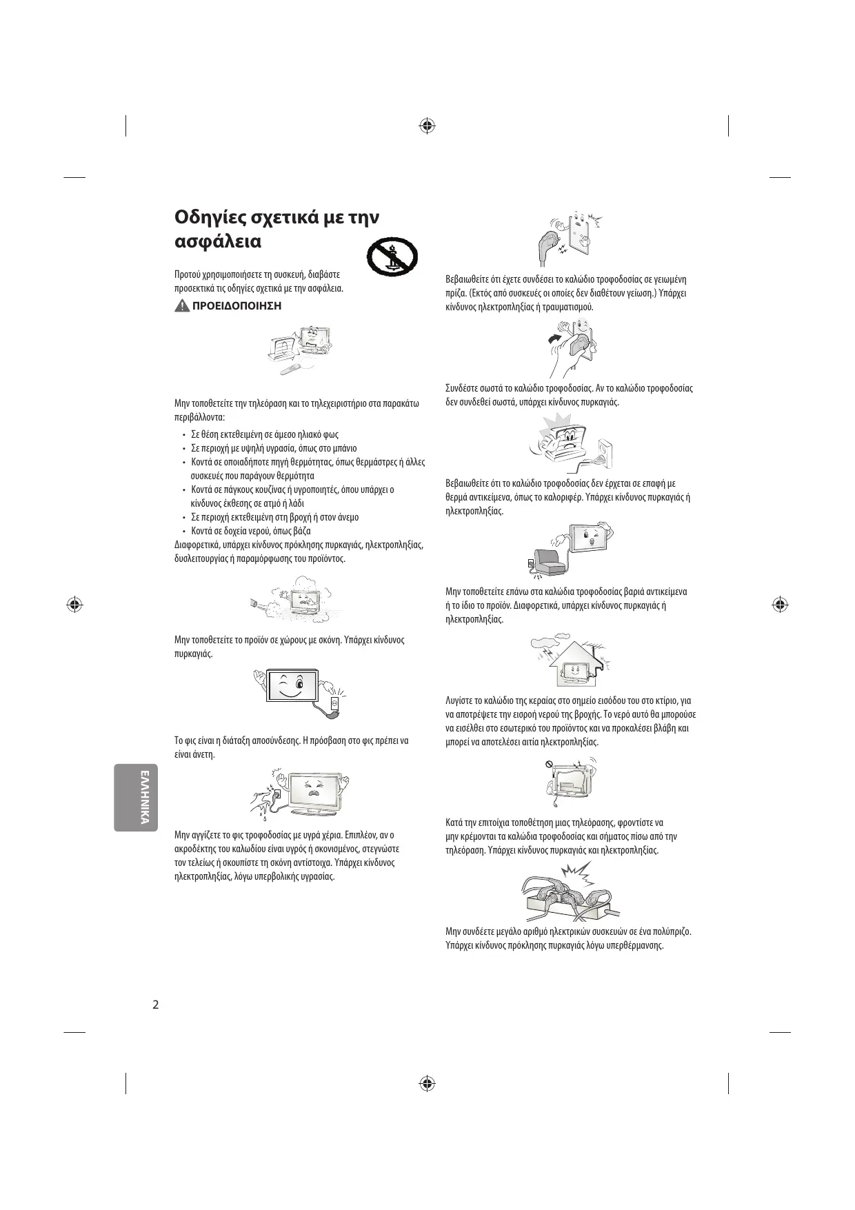 IEEE 802.11a/b/g/n 2400 tot 2483,5 MHz 5150 tot 5250 MHz 5725 tot 5850 MHz (Voor buiten de EU) 802.11a: 11 dBm 802.11b: 14 dBm 802.11g: 10,5 dBm 802.11n - 2,4 GHz: 11 dBm 802.11n - 5 GHz: 12,5 dBm ǼīȋǼǿȇǿǻǿȅȋȇǾȈȉǾ ǹıijȐȜİȚĮțĮȚĮȞĮijȠȡȐ /('79 ǾIJȘȜİȩȡĮıȘ/('IJȘȢ/*įȚĮșȑIJİȚȠșȩȞȘ /&'ȝİijȦIJȚıȝȩ/(' ȆȡȚȞșȑıİIJİıİȜİȚIJȠȣȡȖȓĮIJȘıȣıțİȣȒįȚĮȕȐıIJİ ʌȡȠıİțIJȚțȐIJȠʌĮȡȩȞİȖȤİȚȡȓįȚȠțĮȚijȣȜȐȟIJİIJȠıİ ĮıijĮȜȑȢȝȑȡȠȢȖȚĮȝİȜȜȠȞIJȚțȒĮȞĮijȠȡȐ www.lg.com Οδηγίες σχετικά με την Προτού χρησιμοποιήσετε τη συσκευή, διαβάστε προσεκτικά τις οδηγίες σχετικά με την ασφάλεια. ΠΡΟΕΙΔΟΠΟΙΗΣΗ Μην τοποθετείτε την τηλεόραση και το τηλεχειριστήριο στα παρακάτω περιβάλλοντα: t Σε θέση εκτεθειμένη σε άμεσο ηλιακό φως t Σε περιοχή με υψηλή υγρασία, όπως στο μπάνιο t Κοντά σε οποιαδήποτε πηγή θερμότητας, όπως θερμάστρες ή άλλες συσκευές που παράγουν θερμότητα t Κοντά σε πάγκους κουζίνας ή υγροποιητές, όπου υπάρχει ο κίνδυνος έκθεσης σε ατμό ή λάδι t Σε περιοχή εκτεθειμένη στη βροχή ή στον άνεμο t Κοντά σε δοχεία νερού, όπως βάζα Διαφορετικά, υπάρχει κίνδυνος πρόκλησης πυρκαγιάς, ηλεκτροπληξίας, δυσλειτουργίας ή παραμόρφωσης του προϊόντος. Βεβαιωθείτε ότι έχετε συνδέσει το καλώδιο τροφοδοσίας σε γειωμένη πρίζα. (Εκτός από συσκευές οι οποίες δεν διαθέτουν γείωση.) Υπάρχει κίνδυνος ηλεκτροπληξίας ή τραυματισμού. Συνδέστε σωστά το καλώδιο τροφοδοσίας. Αν το καλώδιο τροφοδοσίας δεν συνδεθεί σωστά, υπάρχει κίνδυνος πυρκαγιάς. Βεβαιωθείτε ότι το καλώδιο τροφοδοσίας δεν έρχεται σε επαφή με θερμά αντικείμενα, όπως το καλοριφέρ. Υπάρχει κίνδυνος πυρκαγιάς ή ηλεκτροπληξίας. Μην τοποθετείτε επάνω στα καλώδια τροφοδοσίας βαριά αντικείμενα ή το ίδιο το προϊόν. Διαφορετικά, υπάρχει κίνδυνος πυρκαγιάς ή ηλεκτροπληξίας. Μην τοποθετείτε το προϊόν σε χώρους με σκόνη. Υπάρχει κίνδυνος