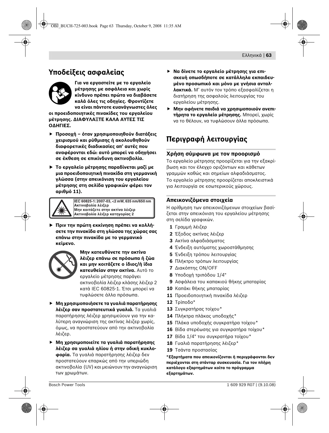 Για να εργαστείτε με το εργαλείο μέτρησης με ασφάλεια και χωρίς κίνδυνο πρέπει πρώτα να διαβάσετε καλά όλες τις οδηγίες. Φροντίζετε να είναι πάντοτε ευανάγνωστες όλες οι προειδοποιητικές πινακίδες του εργαλείου μέτρησης. ΔΙΑΦΥΛΑΞΤΕ ΚΑΛΑ ΑΥΤΕΣ ΤΙΣ f Προσοχή – όταν χρησιμοποιηθούν διατάξεις χειρισμού και ρύθμισης ή ακολουθηθούν διαφορετικές διαδικασίες απ’ αυτές που αναφέρονται εδώ: αυτό μπορεί να οδηγήσει σε έκθεση σε επικίνδυνη ακτινοβολία. f Το εργαλείο μέτρησης παραδίνεται μαζί με μια προειδοποιητική πινακίδα στη γερμανική γλώσσα (στην απεικόνιση του εργαλείου μέτρησης στη σελίδα γραφικών φέρει τον αριθμό 11). IEC 60825-1: 2007-03, <2 mW, 635 nm/650 nm Ακτινοβολία λέιζερ Μην κοιτάζετε στην ακτίνα λέιζερ Ακτινοβολία λέιζερ κατηγορίας 2 f Πριν την πρώτη εκκίνηση πρέπει να κολλήσετε την πινακίδα στη γλώσσα της χώρας σας επάνω στην πινακίδα με το γερμανικό Μην κατευθύνετε την ακτίνα λέιζερ επάνω σε πρόσωπα ή ζώα και μην κοιτάζετε ο ίδιος/ή ίδια κατευθείαν στην ακτίνα. Αυτό το εργαλείο μέτρησης παράγει ακτινοβολία λέιζερ κλάσης λέιζερ 2 κατά IEC 60825-1. Έτσι μπορεί να τυφλώσετε άλλα πρόσωπα. f Μη χρησιμοποιήσετε τα γυαλιά παρατήρησης λέιζερ σαν προστατευτικά γυαλιά. Τα γυαλιά παρατήρησης λέιζερ χρησιμεύουν για την καλύτερη αναγνώριση της ακτίνας λέιζερ χωρίς, όμως, να προστατεύουν από την ακτινοβολία f Μη χρησιμοποιείτε τα γυαλιά παρατήρησης λέιζερ σα γυαλιά ηλίου ή στην οδική κυκλοφορία. Τα γυαλιά παρατήρησης λέιζερ δεν προστατεύουν επαρκώς από την υπεριώδη ακτινοβολία (UV) και μειώνουν την αναγνώριση των χρωμάτων. Bosch Power Tools f Να δίνετε το εργαλείο μέτρησης για επισκευή οπωσδήποτε σε κατάλληλα εκπαιδευμένο προσωπικό και μόνο με γνήσια ανταλλακτικά. Μ’ αυτόν τον τρόπο εξασφαλίζεται η διατήρηση της ασφαλούς λειτουργίας του εργαλείου μέτρησης. f Μην αφήνετε παιδιά να χρησιμοποιούν ανεπιτήρητα το εργαλείο μέτρησης. Μπορεί, χωρίς να το θέλουν, να τυφλώσουν άλλα πρόσωπα. Περιγραφή λειτουργίας Χρήση σύμφωνα με τον προορισμό Το εργαλείο μέτρησης προορίζεται για την εξακρίβωση και τον έλεγχο οριζόντιων και κάθετων γραμμών καθώς και σημείων αλφαδιάσματος. Το εργαλείο μέτρησης προορίζεται αποκλειστικά για λειτουργία σε εσωτερικούς χώρους. Απεικονιζόμενα στοιχεία Η αρίθμηση των απεικονιζόμενων στοιχείων βασίζεται στην απεικόνιση του εργαλείου μέτρησης στη σελίδα γραφικών.