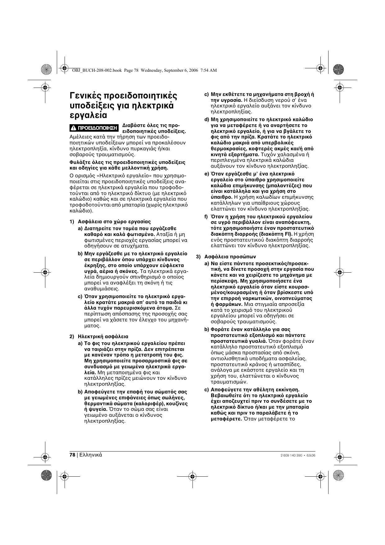 a) Να είστε πάντοτε προσεκτικς/προσεκτική, να δίνετε προσοχή στην εργασία που κάνετε και να χειρίζεστε το µηχάνηµα µε περίσκεψη. Μη χρησιµοποιήσετε ένα ηλεκτρικ εργαλείο ταν είστε κουρασµένος/κουρασµένη ή ταν βρίσκεστε υπ την επιρροή ναρκωτικών, οινοπνεύµατος ή φαρµάκων. Μια στιγµιαία απροσεξία κατά το χειρισµ του ηλεκτρικού εργαλείου µπορεί να οδηγήσει σε σοβαρούς τραυµατισµούς. b) Φοράτε έναν κατάλληλο για σας προστατευτικ εξοπλισµ και πάντοτε προστατευτικά γυαλιά. 'ταν φοράτε έναν κατάλληλο προστατευτικ εξοπλισµ πως µάσκα προστασίας απ σκνη, αντιολισθητικά υποδήµατα ασφαλείας, προστατευτικ κράνος ή ωτασπίδες, ανάλογα µε εκάστοτε εργαλείο και τη χρήση του, ελαττώνεται ο κίνδυνος τραυµατισµών. c) Αποφεύγετε την αθέλητη εκκίνηση. Βεβαιωθείτε τι το ηλεκτρικ εργαλείο έχει αποζευχτεί πριν το συνδέσετε µε το ηλεκτρικ δίκτυο ή/και µε την µπαταρία καθώς και πριν το παραλάβετε ή το µεταφέρετε. 'ταν µεταφέρετε το 2 609 140 390 • 6.9.06 OBJ_BUCH-208-002.book Page 79 Wednesday, September 6, 2006 7:54 AM ηλεκτρικ εργαλείο έχοντας το δάχτυλ σας στο διακπτη ή ταν συνδέσετε το µηχάνηµα µε την πηγή ρεύµατος ταν αυτ είναι ακµη συζευγµένο, ττε δηµιουργείται κίνδυνος τραυµατισµών. d) Αφαιρείτε απ τα ηλεκτρικά εργαλεία τυχν συναρµολογηµένα εργαλεία ρύθµισης ή κλειδιά πριν θέσετε το ηλεκτρικ εργαλείο σε λειτουργία. Ένα εργαλείο ή κλειδί συναρµολογηµένο σ’ ένα περιστρεφµενο τµήµα ενς µηχανήµατος µπορεί να οδηγήσει σε τραυµατισµούς. e) Μην υπερεκτιµάτε τον εαυτ σας. Φροντίζετε για την ασφαλή στάση του σώµατς σας και διατηρείτε πάντοτε την ισορροπία σας. Έτσι µπορείτε να ελέγξετε καλύτερα το µηχάνηµα σε περιπτώσεις απροσδκητων περιστάσεων. f) Φοράτε κατάλληλα ενδύµατα. Μη φοράτε φαρδιά ρούχα ή κοσµήµατα. Κρατάτε τα µαλλιά σας, τα ρούχα σας και τα γάντια σας µακριά απ κινούµενα εξαρτήµατα. Χαλαρή ενδυµασία, κοσµήµατα ή µακριά µαλλιά µπορεί να εµπλακούν στα κινούµενα εξαρτήµατα. g) &ταν υπάρχει η δυναττητα συναρµολγησης διατάξεων αναρρφησης ή συλλογής σκνης, βεβαιωθείτε τι αυτές είναι συνδεµένες µε το µηχάνηµα καθώς και τι χρησιµοποιούνται σωστά. Η χρήση µιας αναρρφησης σκνης µπορεί να ελαττώσει τον κίνδυνο που προκαλείται απ τη σκνη.
