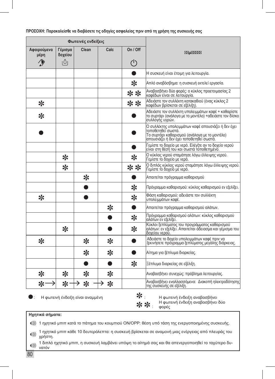 Vider le collecteur de marc (un cycle de 2 cafés est en cours). Vider le collecteur de marc + nettoyer le tiroir (suivant modèle) + vider le bac récolte-gouttes. Le collecteur de marc est absent ou mal positionné. Le tiroir de nettoyage (suivant modèle) est absent ou mal positionné. Remplir le réservoir d'eau. Le réservoir d'eau est absent ou mal positionné. Le cycle café a été interrompu par manque d'eau. Remplir le réservoir d'eau. Le cycle double café a été interrompu par manque d'eau. Remplir le réservoir. Programme de nettoyage demandé. Programme de nettoyage : cycle de nettoyage en cours. Phase de nettoyage : vider le bac à marc. Programme de détartrage demandé. Programme de détartrage : cycle de détartrage en cours. Cycles de rinçage du programme de détartrage : en cours. Demande de vider et de remplir le réservoir d'eau. Vider le bac à cake avant le lancement d'un rinçage long. Demande rinçage long. Rinçage long en cours. Clignotement Simultané : anomalie de fonctionnement. Clignotement voyant après voyant : mise en hors tension de l'appareil en cours. :