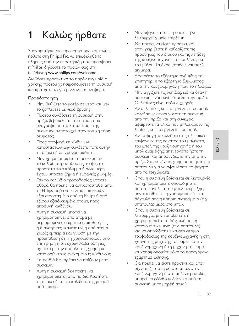Συγχαρητήρια για την αγορά σας και καλώς ήρθατε στη Philips! Για να επωφεληθείτε πλήρως από την υποστήριξη που προσφέρει η Philips, δηλώστε το προϊόν σας στη διεύθυνση www.philips.com/welcome. Διαβάστε προσεκτικά το παρόν εγχειρίδιο χρήσης προτού χρησιμοποιήσετε τη συσκευή και κρατήστε το για μελλοντική αναφορά. Προειδοποίηση • Μην βυθίζετε το μοτέρ σε νερό και μην το ξεπλένετε με νερό βρύσης. • Προτού συνδέσετε τη συσκευή στην πρίζα, βεβαιωθείτε ότι η τάση που αναγράφεται στο κάτω μέρος της συσκευής αντιστοιχεί στην τοπική τάση ρεύματος. • Προς αποφυγή επικίνδυνων καταστάσεων, μην συνδέετε ποτέ αυτήν τη συσκευή σε χρονοδιακόπτη. • Μην χρησιμοποιείτε τη συσκευή αν το καλώδιο τροφοδοσίας, το φις, το προστατευτικό κάλυμμα ή άλλα μέρη έχουν υποστεί ζημιά ή εμφανείς ρωγμές. • Εάν το καλώδιο τροφοδοσίας υποστεί φθορά, θα πρέπει να αντικατασταθεί από τη Philips, από ένα κέντρο επισκευών εξουσιοδοτημένο από τη Philips ή από εξίσου εξειδικευμένα άτομα, προς αποφυγή κινδύνου. • Αυτή η συσκευή μπορεί να χρησιμοποιηθεί από άτομα με περιορισμένες σωματικές, αισθητήριες ή διανοητικές ικανότητες ή από άτομα χωρίς εμπειρία και γνώση, με την προϋπόθεση ότι τη χρησιμοποιούν υπό επιτήρηση ή ότι έχουν λάβει οδηγίες σχετικά με την ασφαλή της χρήση και κατανοούν τους ενεχόμενους κινδύνους. • Τα παιδιά δεν πρέπει να παίζουν με τη συσκευή. • Αυτή η συσκευή δεν πρέπει να χρησιμοποιείται από παιδιά. Κρατήστε τη συσκευή και το καλώδιό της μακριά από παιδιά.