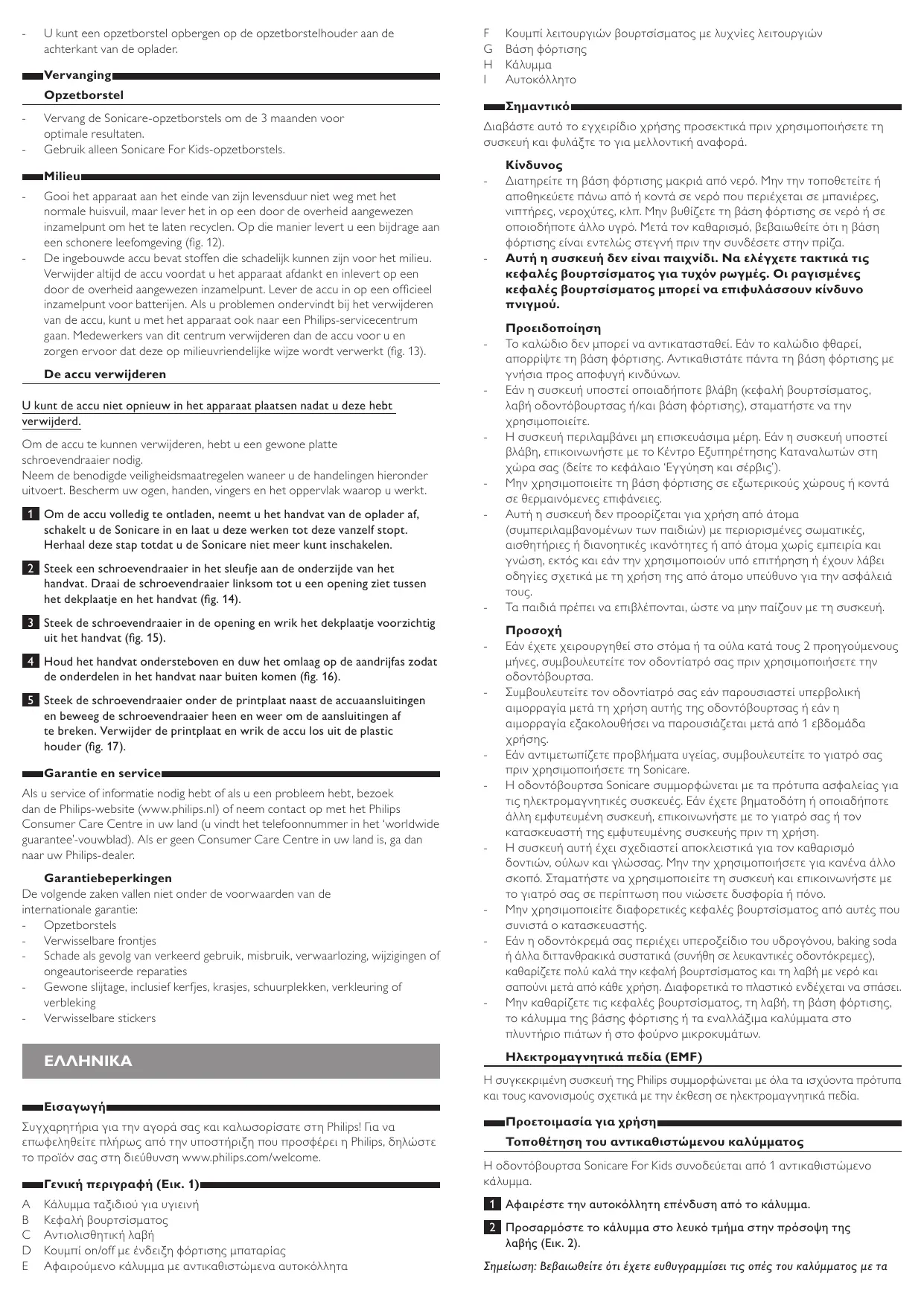 Vervang de Sonicare-opzetborstels om de 3 maanden voor optimale resultaten. Gebruik alleen Sonicare For Kids-opzetborstels. Διαβάστε αυτό το εγχειρίδιο χρήσης προσεκτικά πριν χρησιμοποιήσετε τη συσκευή και φυλάξτε το για μελλοντική αναφορά. Milieu