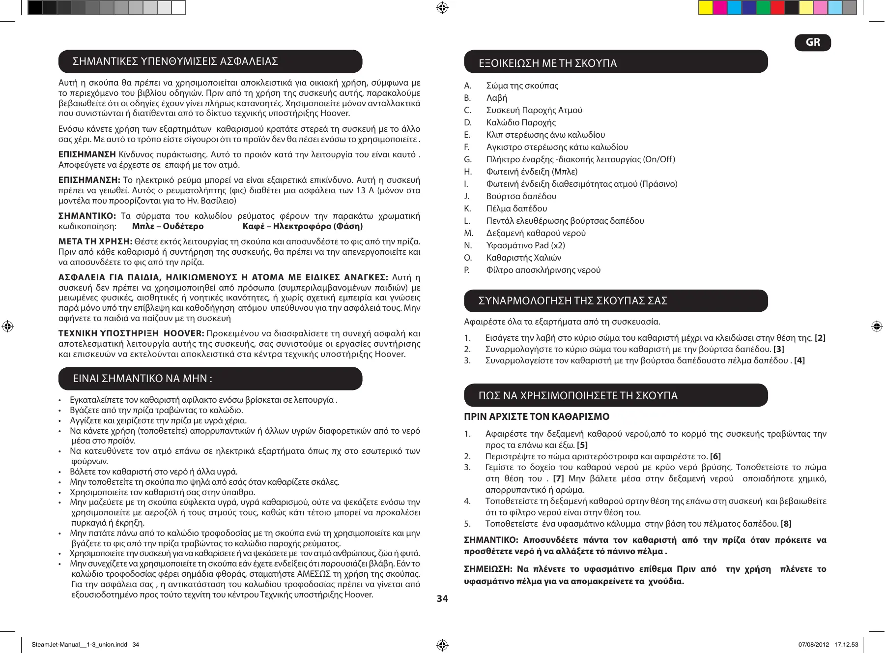 Εγκαταλείπετε τον καθαριστή αφίλακτο ενόσω βρίσκεται σε λειτουργία . Βγάζετε από την πρίζα τραβώντας το καλώδιο. Αγγίζετε και χειρίζεστε την πρίζα με υγρά χέρια. Να κάνετε χρήση (τοποθετείτε) απορρυπαντικών ή άλλων υγρών διαφορετικών από το νερό μέσα στο προϊόν. Να κατευθύνετε τον ατμό επάνω σε ηλεκτρικά εξαρτήματα όπως πχ στο εσωτερικό των Βάλετε τον καθαριστή στο νερό ή άλλα υγρά. Μην τοποθετείτε τη σκούπα πιο ψηλά από εσάς όταν καθαρίζετε σκάλες. Χρησιμοποιείτε τον καθαριστή σας στην ύπαιθρο. Μην μαζεύετε με τη σκούπα εύφλεκτα υγρά, υγρά καθαρισμού, ούτε να ψεκάζετε ενόσω την χρησιμοποιείτε με αεροζόλ ή τους ατμούς τους, καθώς κάτι τέτοιο μπορεί να προκαλέσει πυρκαγιά ή έκρηξη. Μην πατάτε πάνω από το καλώδιο τροφοδοσίας με τη σκούπα ενώ τη χρησιμοποιείτε και μην βγάζετε το φις από την πρίζα τραβώντας το καλώδιο παροχής ρεύματος. Χρησιμοποιείτε την συσκευή για να καθαρίσετε ή να ψεκάσετε με τον ατμό ανθρώπους, ζώα ή φυτά. Μην συνεχίζετε να χρησιμοποιείτε τη σκούπα εάν έχετε ενδείξεις ότι παρουσιάζει βλάβη. Εάν το καλώδιο τροφοδοσίας φέρει σημάδια φθοράς, σταματήστε ΑΜΕΣΩΣ τη χρήση της σκούπας. Για την ασφάλεια σας , η αντικατάσταση του καλωδίου τροφοδοσίας πρέπει να γίνεται από εξουσιοδοτημένο προς τούτο τεχνίτη του κέντρου Τεχνικής υποστήριξης Hoover. SteamJet-Manual__1-3_union.indd 34 Πως να χρησιμοποιήσετε τη σκούπα ΠΡΙΝ ΑΡΧΙΣΤΕ ΤΟΝ ΚΑΘΑΡΙΣΜΟ