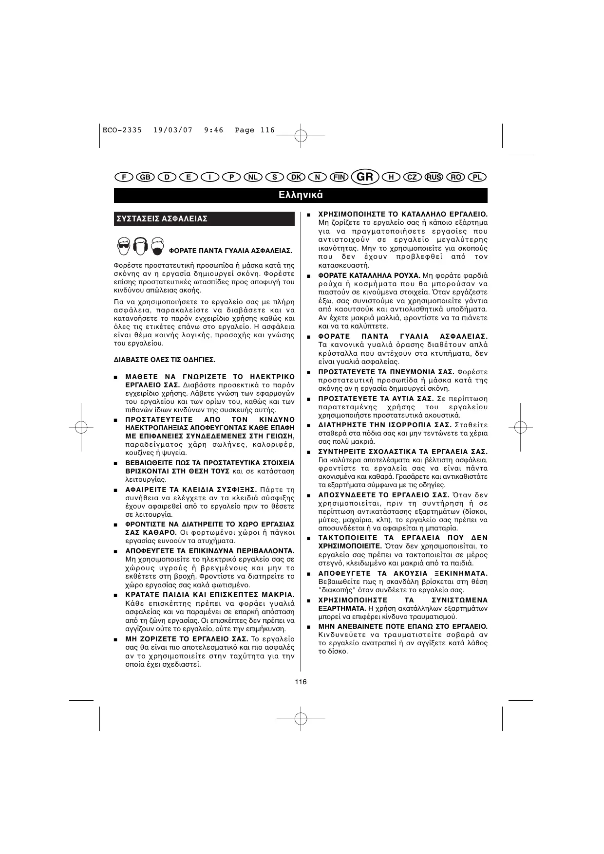 χρησιµοποιήστε προστατευτικά ακουστικά. ∆ΙΑΤΗΡΗΣΤΕ ΤΗΝ ΙΣΟΡΡΟΠΙΑ ΣΑΣ. Σταθείτε σταθερά στα πδια σας και µην τεντώνετε τα χέρια σας πολύ µακριά. ΣΥΝΤΗΡΕΙΤΕ ΣΧΟΛΑΣΤΙΚΑ ΤΑ ΕΡΓΑΛΕΙΑ ΣΑΣ. Για καλύτερα αποτελέσµατα και βέλτιστη ασφάλεια, φροντίστε τα εργαλεία σας να είναι πάντα ακονισµένα και καθαρά. Γρασάρετε και αντικαθιστάτε τα εξαρτήµατα σύµφωνα µε τις οδηγίες. ΑΠΟΣΥΝ∆ΕΕΤΕ ΤΟ ΕΡΓΑΛΕΙΟ ΣΑΣ. 0ταν δεν χρησιµοποιείται, πριν τη συντήρηση ή σε περίπτωση αντικατάστασης εξαρτηµάτων (δίσκοι, µύτες, µαχαίρια, κλπ), το εργαλείο σας πρέπει να αποσυνδέεται ή να αφαιρείται η µπαταρία. ΤΑΚΤΟΠΟΙΕΙΤΕ ΤΑ ΕΡΓΑΛΕΙΑ ΠΟΥ ∆ΕΝ ΧΡΗΣΙΜΟΠΟΙΕΙΤΕ. 0ταν δεν χρησιµοποιείται, το εργαλείο σας πρέπει να τακτοποιείται σε µέρος στεγν, κλειδωµένο και µακριά απ τα παιδιά. ΑΠΟΦΕΥΓΕΤΕ ΤΑ ΑΚΟΥΣΙΑ ΞΕΚΙΝΗΜΑΤΑ. Βεβαιωθείτε πως η σκανδάλη βρίσκεται στη θέση "διακοπής" ταν συνδέετε το εργαλείο σας. ΧΡΗΣΙΜΟΠΟΙΗΣΤΕ ΣΥΝΙΣΤΩΜΕΝΑ ΕΞΑΡΤΗΜΑΤΑ. Η χρήση ακατάλληλων εξαρτηµάτων µπορεί να επιφέρει κίνδυνο τραυµατισµού. ΜΗΝ ΑΝΕΒΑΙΝΕΤΕ ΠΟΤΕ ΕΠΑΝΩ ΣΤΟ ΕΡΓΑΛΕΙΟ. Κινδυνεύετε να τραυµατιστείτε σοβαρά αν το εργαλείο ανατραπεί ή αν αγγίξετε κατά λάθος